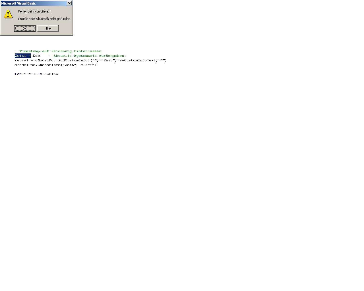 Komische Sache! Da ist ein Verweis wohl nicht angekreuzt! Ich habe folgende: - Visual Basic for Application - SolidWorks Extensibilty Type Library - OLE Automation - SldWorks 2007 TL - SolidWorks 2007 Constant TL - SolidWorks 2007 Commands TL - Microsoft Forms 2.0 Object Library Aber Du kannst auch, wenn Du das Zeit-Ding nicht brauchst, einfach die paar Zeilen kommentieren. ------------------ Eine Antwort auf diesen Beitrag verfassen (mit Zitat/Zitat des Beitrags) IP |