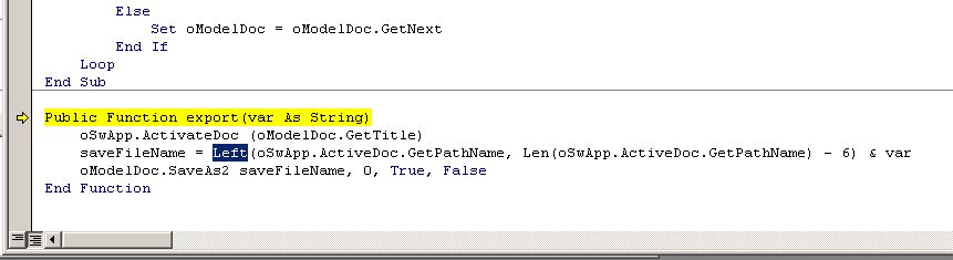 Hallo, so jetzt bin ich ein wening von der Rolle, das Makro von G.Dawg klappt ja ganz gut, und es ist auch eine super Sache. Nur wenn ich PDF erstellen will bringt er mir immer den Fehler im Code an der Stelle (Left) Code: ausschnitt Public Function export(var As String) oSwApp.ActivateDoc (oModelDoc.GetTitle) saveFileName = Left(oSwApp.ActiveDoc.GetPathName, Len(oSwApp.ActiveDoc.GetPathName) - 6) + var oModelDoc.SaveAs2 saveFileName, 0, True, False End Function