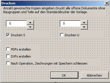 If wannaPrintThat = True Then For i = 1 To COPIES If PrintText = True Then ' PrintText wäre jetzt nun Deine Variable (Boolean) von dem saveasDXF Beispiel mit dem Kreuzchen auf dem Formular retval = oModelDoc.AddCustomInfo3("", "COPYCOUNT", swCustomInfoText, "") oModelDoc.CustomInfo("COPYCOUNT") = i & " von " & COPIES 'Dokument zwingen sich neu aufzubauen bRet = oModelDoc.ForceRebuild3(False) 'Dokument auf den Standarddrucker Drucken oModelDoc.PrintDirect End if Next i End if