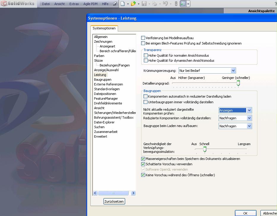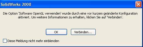 Hallo zusammen, beim Start von SWX2008 SP4 erzählt mir mein SWX, daß die Option "OPENGL" quasi zwangsaktiviert wurde. Ich kann den Haken auch nicht wieder rausnehmen, obwohl kein Dokument geöffnet ist.??? An den Grafikkarteneinstellungen hab ich nichts angefasst, alles ist wie immer. (Quadro FX4500 mit zertifiziertem Treiber 6.14.10.9185) Ich hatte auch bis jetzt keine Probleme mit dieser Karte. Ist jemandem das schonmal untergekommen? Ich kann den Rechner grad nicht neu starten, bin per Remote von Zuhause drauf.