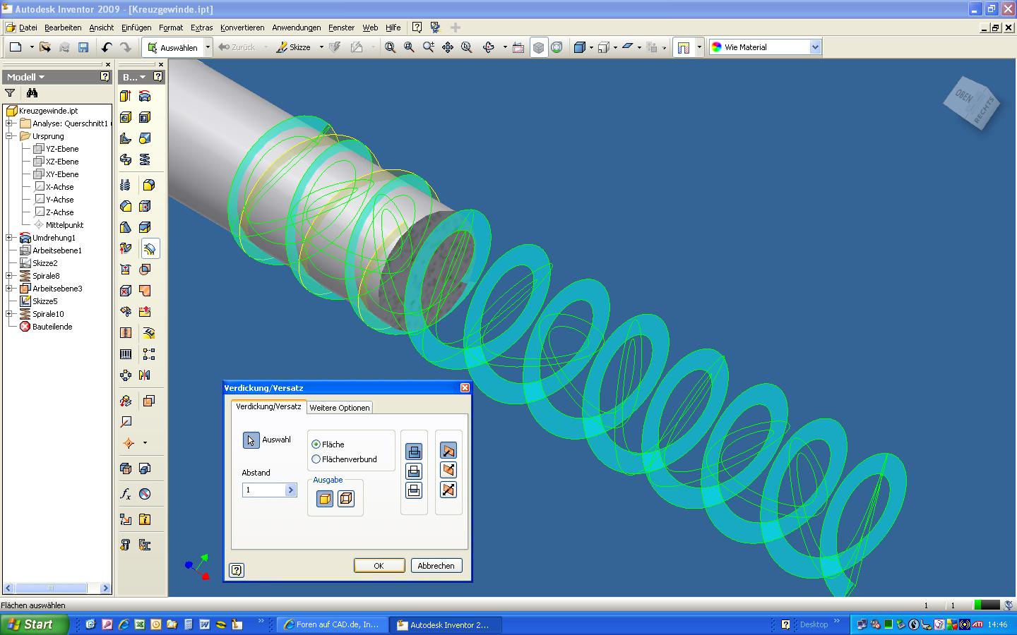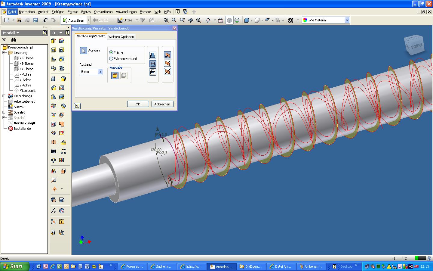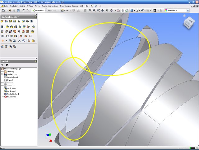 Hallo! Ich hab da eine Welle, auf der ich ein Kreuzgewinde erstellen möchte. mit der DIVA 2008 hab ich das hinbekommen bei 2009 kann ich die Spiralflächen noch erzeugen, beim entfernen der Nut durch Aufdicken der gespiegelten Spiralfläche kommt dann aber eine Fehlermeldung das sich Kanten/Flächen schneiden. Die Vorschau beim Aufdicken sieht auch schon so komisch aus (siehe Bild), als ob da noch eine gespiegelte Sirale vorhanden wäre. Mache ich da was falsch? PS: Beispiel mit DIVA 2009 Vielen dank, Bert