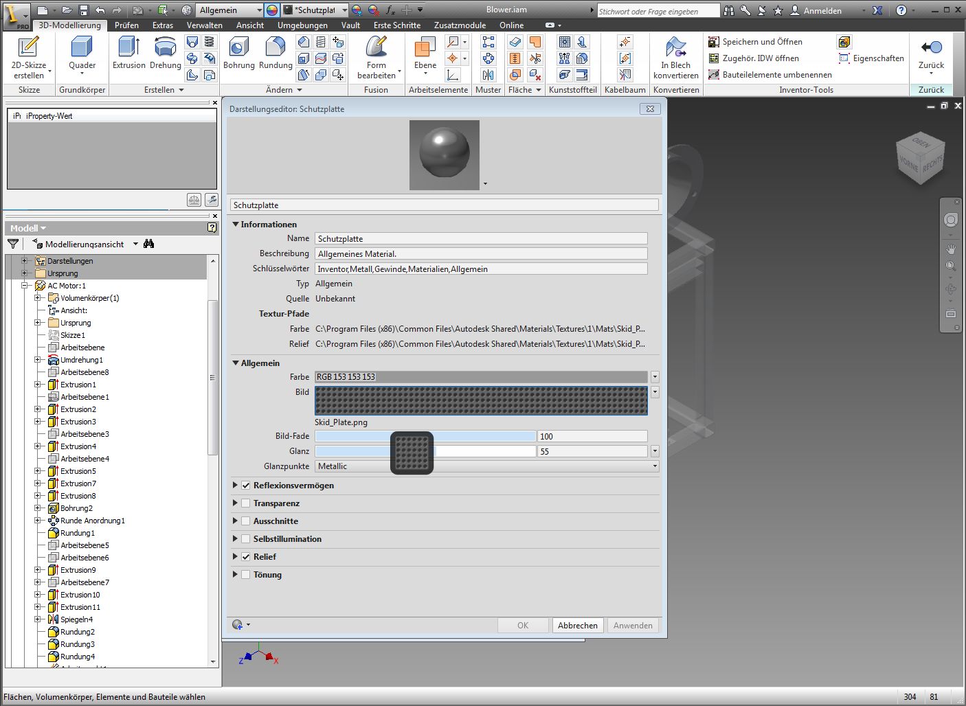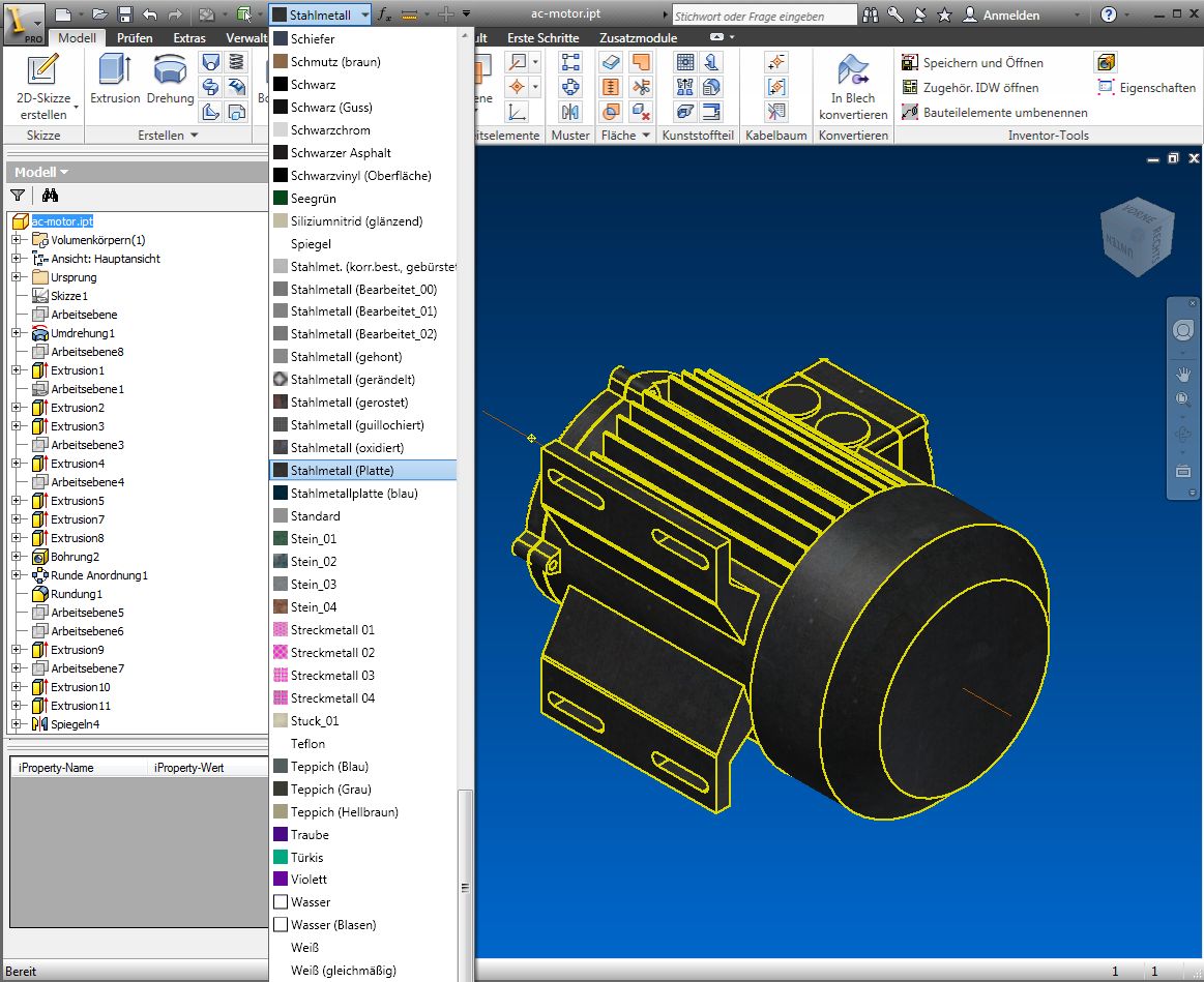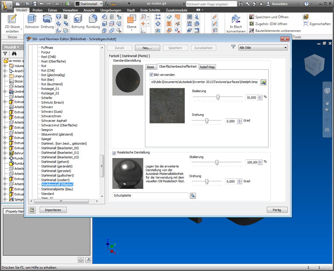 Tja, das sind wahrscheinlich Übersetzungsfehler innerhalb der Darstellungsbibliotheken. Ich habe diesen Supportfall mal bei Autodesk pupliziert; das hat aber dort keinen interessiert... Das Ganze lässt sich einfach mit den Samples aus Inventor 2012 nachstellen: Öffnet man die Datei „AC Motor.ipt“, die beim „Blower“ in den Samples für Inventor 2012 zu finden ist, in Inventor 2012, ist der Farbstil „Stahlmetall (Platte)“ zugewiesen. Wird diese Datei in Inventor 2013 SP1.1 (geht auch ohne SP) geladen und die Darstellungen umgewandelt, wird als Darstellungsstil „Schutzplatte“ verwendet und man hat als Bild „Skid_Plate.png“ als Textur auf dem Motor liegen. Wie viele Dateien sind denn betroffen? Es gibt in 2013 einen Befehl mit dem man die Texturen löschen kann. Das ist bei vielen Dateien aber sehr mühsam.