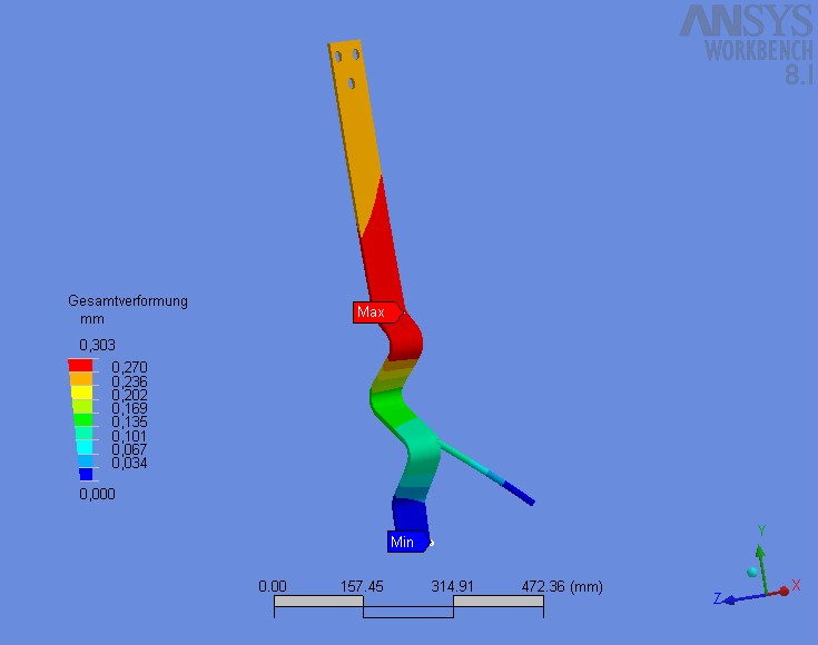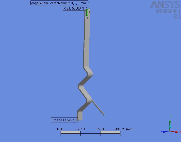 Workbench (DesignSpace) also. Das hätte man wissen sollen. Ich glaube, dass Deine Vorgehensweise prinzipiell richtig ist. (Hatten selbst mal DesignSpace 6 auf einem Rechner) Dieses Programm hat aber nach meinen Informationen nur eingeschränkte Fähigkeiten, nichtlineare Simulationen durchzuführen. Große Verformungen kann man links unten im "Workbench Explorer" aktivieren. Eine komplette Materialkennlinie kann man aber nach meinen Informationen nicht eingeben. Legt man also für ein solches Teil z.B. einen Baustahl St-52.3 nach DIN 17100 zugrunde, so ist bei ca. 350 N/mm^2 das Ende der Fahnenstange für lineare Berechnungen erreicht. Ich hab mal einen Praktiker (unser Werkstattmeister) befragt, was denn so ein Teil aushalten könne. Er sagt: "10 Sack Zement" Das wären ca. 5000N Eine Antwort auf diesen Beitrag verfassen (mit Zitat/Zitat des Beitrags) IP |