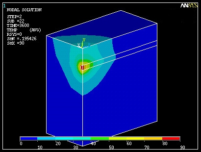 Selbst wenn es gelänge, die Temperatur an der Stirnseite eines Bewehrungsstabes konstant zu halten (z.B. 90°), kann man damit kaum den Beton aufheizen. Das Bild zeigt die Temperaturverteilung nach einer Stunde für einen Betonklotz mit 200 mm Kantenlänge. Um zu dieser Erkenntnis zu kommen, hätte es nicht ANSYS bedurft, aber die ANSYS-Rechnung zeigt es besonders anschaulich. Andere Temperaturen und Abmessungen lassen sich mit dem angehängten Quelltext untersuchen. Eine Antwort auf diesen Beitrag verfassen (mit Zitat/Zitat des Beitrags) IP |