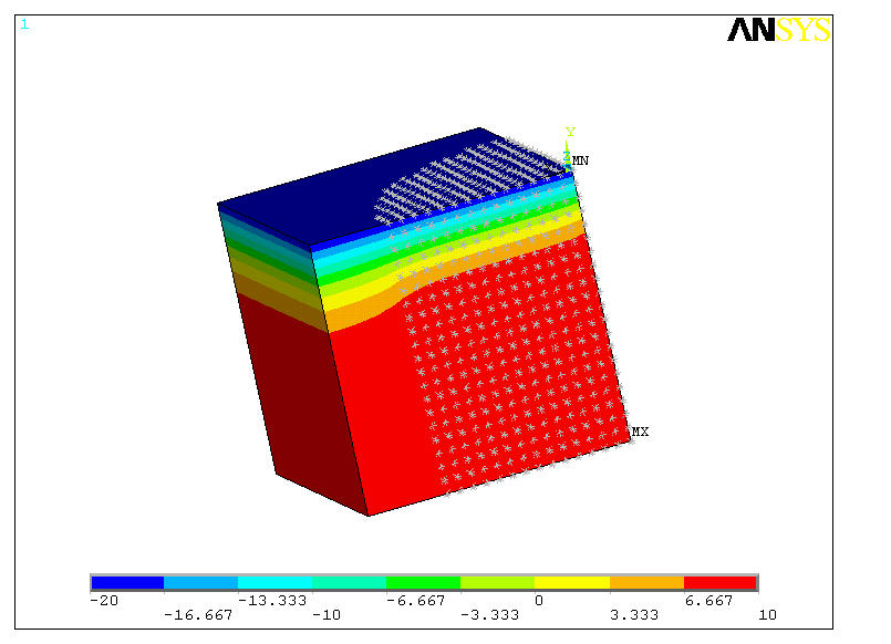 !------Lasten------------------------- tumg=8 !Umgebungstemperatur tkalt=-12 tunif,tumg nsel,s,loc,y,0 !Knoten an der Oberfläche alfa=100 !Wärmeübergangszahl sf,all,conv,alfa,tkalt nsel,s,loc,y,-bedi-undi-bodi !Knoten unten (Erdwärme) d,all,temp,tumg