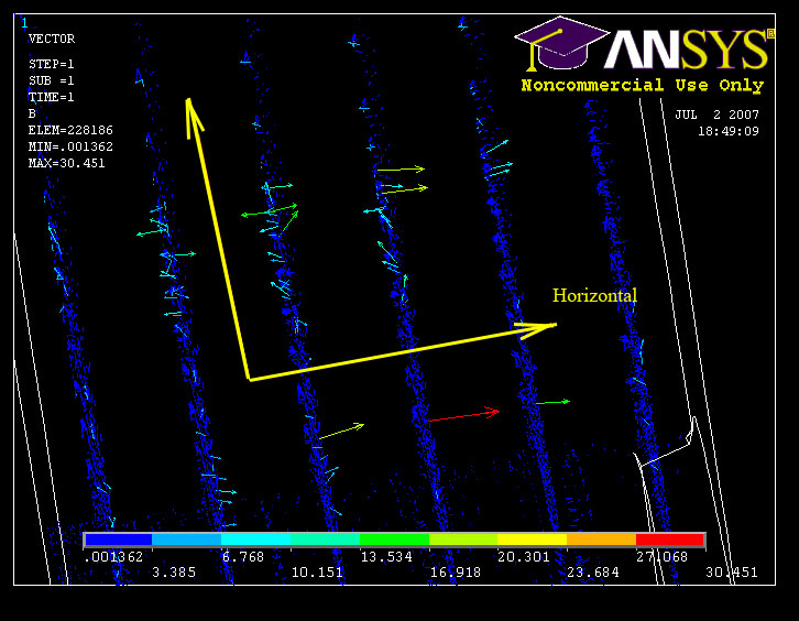 Im Bild (Simulation) treten Induktionen mit bis zu 28T(!!) auf, die in HORIZONTALTER Richtung verlaufen – was praktisch nicht möglich ist.