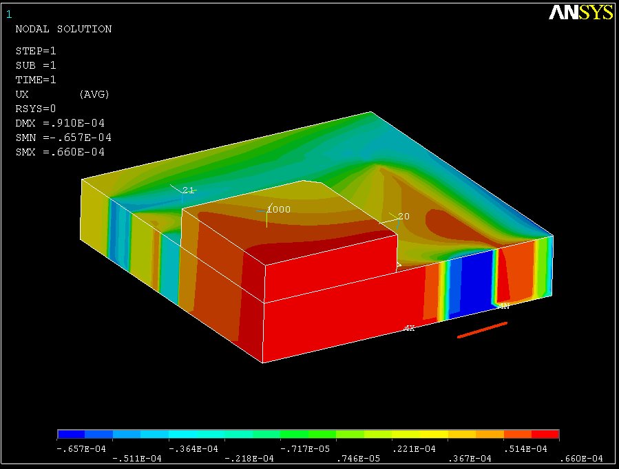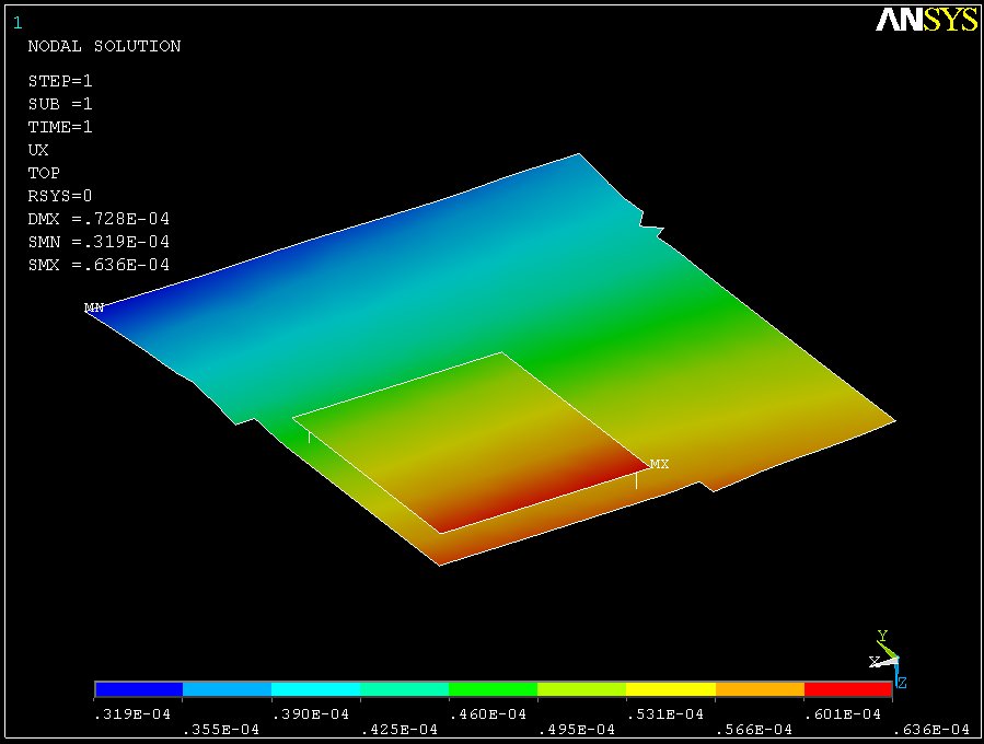 ich plage mich gerade mit einem Submodell herum. Vom Prinzip her funktioniert alles so, wie es in der ANSYS Hilfe geschildert wird allerdings habe ich ein Problem. Die Verschiebungen des globalen Modells in der Schnittebene werden nicht richtig als Randbedingung im detaillierten Modell aufgebracht. Seltsamerweise scheint die aufgebrachte Verschiebung im Submodell vom Element- Koordinatensystem der Elemente des globalen Modells abzuhängen. (siehe Anhang). Im globalen Modell sind in der Zone der roten Linie die Koordinatensysteme der Elemente gegenüber den anderen Elementen verdreht. Plotte ich mir nun die Verschiebungen in x- Richtung des globalen Modells und vergleiche diese mit dem detaillierten Modell passiert genau in dieser Zone etwas "seltsames".