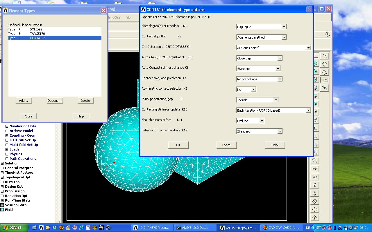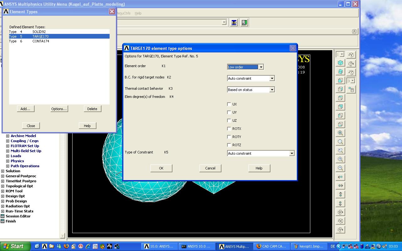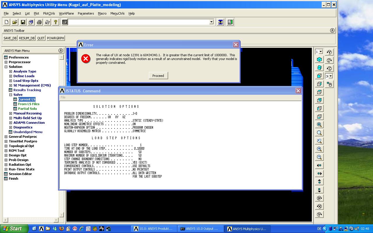Zitat: Original erstellt von denizcan05: Hi, ich habe ein kleines Problem, das ich seit langen nicht lösen kann. Da ich immer mit maus arbeite, kann ich apdl sprache hier nich hinfügen. Deswegen habe ich die bilder hingefügt. ich habe in ansys ein kugel und platte, die beide elastisch sind, erstellt die knoten auf der fläche wird fest eingespant und auf der punkt Kraft gegeben. Egal was ich mache habe ich immer gleiche fehler. The value ux, oder uy...... Als Ansys anfänger weißes ich nicht mehr, was ich machen soll wenn jemand mir helfen könnte,wäre ich dankbar.