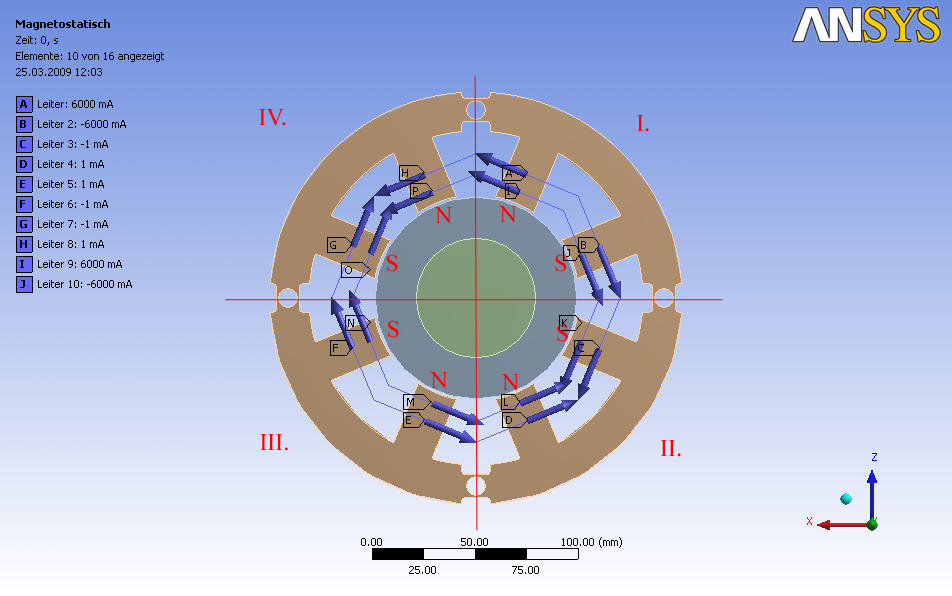 Hallo Leute, ich bin neu hier und brauche gleich eure Hilfe. Ich muss in Rahmen meiner Diplomarbeit einen Magnetlager simulieren. Ziel meiner Arbeit ist die magnetische Kraft in Abhängigkeit vom Strom und von der Lage des Rotors zu bestimmen. Der Magnetlager hat 8 Pole und auf jedem Pol sitzen zwei Spulen mit à 60 Windungen. Jede Spule wird max. mit 6A bestromt. Der Stator und der äußere Rotor-Ring sind aus Elektorblech und der Rotor-Kern aus nicht feromag. Edelstahl. Der Magnetlager ist in vier Quadranten aufgeteilt. Um in jedem Quadrant einen geschlossenen magnetischen Kreis zu haben, werden die Spulen in unterschiedliche Richtungen bestromt. (siehe Anhang). So liegt in jedem Quadrant eine geschlossener mag. Kreis vor. Hier werden nur die Spulen im I. Quadrant mit à 6A bestromt. Aus der analytischen Berechnung würde eine Kraft in Z-Richtung von 2284,5N ermittelt. Die Kraft-Komponente in Z-Richtung aus der Simulation beträgt jedoch 554N. Um den Fehler bei der Simulation zu finden, habe ich das Modell mit einer Spule pro Pol statt mit zwei Spulen modelliert. Die Spulen haben hier doppelt so viele Windungen (statt 60 , jetzt 120) und diese werden mit 12A statt mit 6A bestromt. Hier erhält man die erwartete Kraft von ca. 2285N je nach Einstellung. Meiner Meinung nach dürfte es bei der Kraft-Berechnung keinen Unterschied machen ob ich eine Spule pro Pol nehme mit à 120 Windungen und 12A oder zwei Spulen mit à 60 Windungen und 6A pro Spule. Ich möchte Sie gerne fragen, ob Sie mir bei meinem Problem helfen könnten. [IMG][/IMG]