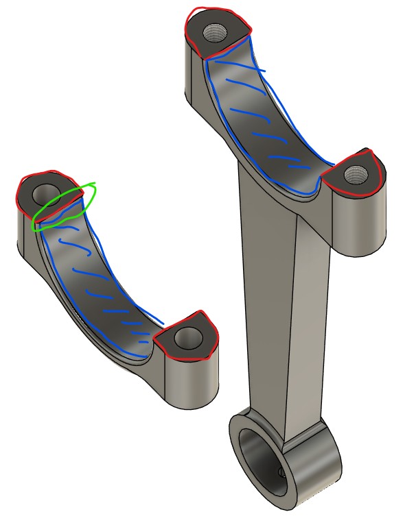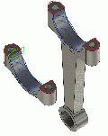 In der statischen Strukturanalyse möchte ich jedoch nur die Pleuelstange selbst berücksichtigen. Dazu habe ich die anderen Komponenten unterdrückt. Als Last wurde eine Bolzenlast in das kleine Pleuelauge eingefügt. Um die Randbedingungen festzulegen, wurde der Kontakt zwischen den Pleuelhälften als Verbund (rot markiert) festgelegt und an den blau markierten Stellen eine zylindrische Lagerung eingefügt, die in alle drei Richtungen fixiert ist. Nun erscheint in Ansys die Fehlermeldung „Es wurde eine Überlappung zwischen einem oder mehreren Kontaktbereichen und den auf Ihr Modell angewendeten Randbedingungen festgestellt. Daher wird für diese Kontakte die erweiterte Lagrange-Formulierung als programmgesteuerte Option verwendet“.