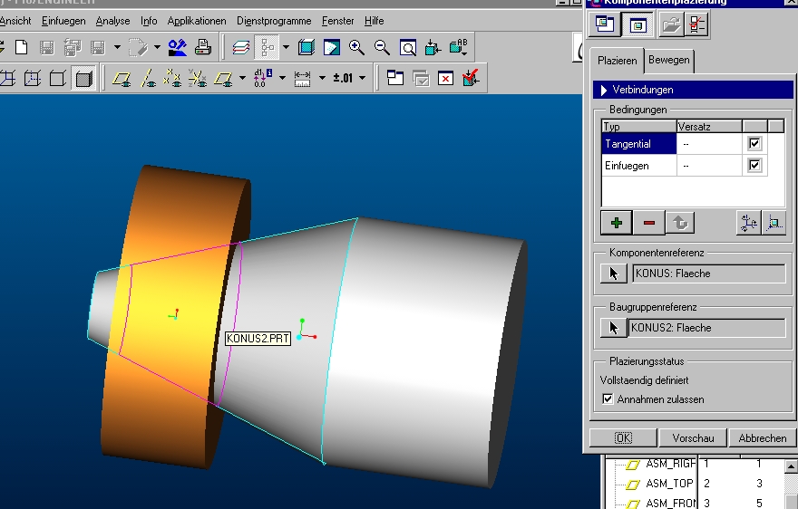 Hallo Kai Das Aufliegen der Kegelfläche müsstest Du eigentlich über "Gegenrichten" hinbekommen. Einfach die Kegelflächen anwählen, fertig. Das mit der Hülse habe ich leider nicht ganz begriffen... Gruss Sonja  Eine Antwort auf diesen Beitrag verfassen (mit Zitat/Zitat des Beitrags) IP |