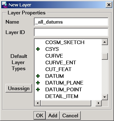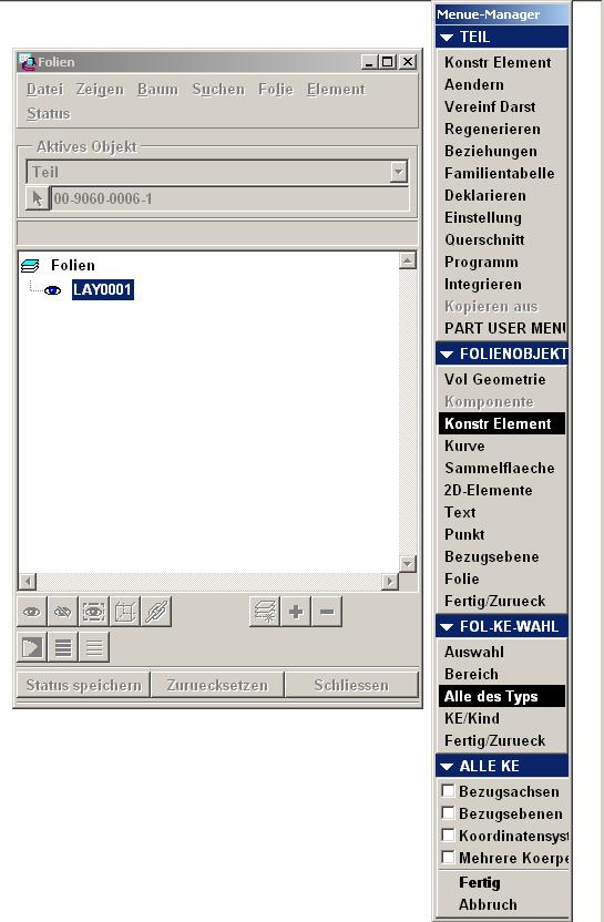 Es gibt so eine nette config.pro Option, die da heißt def_layer mit verschiedenen Optionen, wie z.B. layer_datums dann kommt ein Blank und dann der Name des Layers z.B. _PLANES. Dann passiert folgendes: Sobald ein Feature dieses Types angelegt wird, wird es automatisch auf diesen Layer gepackt. Den Underline haben wir an dem Namen, damit jeder erkennt, dass es ein Standard-Layer ist. Bei uns heißen die config-Einträge so: DEF_LAYER LAYER_AXIS _AXES DEF_LAYER LAYER_COSM_SKETCH _COSMETICS DEF_LAYER LAYER_CSYS _CSYS DEF_LAYER LAYER_CURVE _CURVES DEF_LAYER LAYER_DATUM _PLANES DEF_LAYER LAYER_DRAFT_ENTITY _DRW_DETAILS DEF_LAYER LAYER_DRAFT_GRP _DRW_DETAILS DEF_LAYER LAYER_DWG_TABLE _NOTES DEF_LAYER LAYER_NOTE _NOTES DEF_LAYER LAYER_POINT _POINTS DEF_LAYER LAYER_SURFACE _SURFACES DEF_LAYER LAYER_SYMBOL _SYMBOLS DEF_LAYER LAYER_THREAD_FEAT _THREADS Das hilft natürlich nur für später. Um alle existierenden Feature auf die Folien zu bekommen, hilft die Methode von sinzig oder highend oder ModelCHECK (Hier könnte ich evtl. auch mit einem mc-config-file dienen). Zur Methode von highend empfiehlt sich noch Folgendes: Damit die Namen in allen Modellen auch gleich sind (siehe auch def_layer ...) kann man sich im Layer-Fenster unter File/Datei mit save_status_file auch ein Layer Template erzeugen (inclusive Layerstatus) z.B. layers_default_template.pro. Dieses File kannst Du in jedem Modell aufrufen (prt, asm, drw, ...) und hast damit die Namen erzeugt. Anschließend belegst Du die Folien wie Highend es beschrieben hat. Das Ganze zeiichnest Du Dir als Mapkey auf, und schon hast Du es auf Knopfdruck zur Verfügung. Na, krieg ich jetzt 10 Punkte für meinen ersten Bugatti?  ------------------ freundlich grüßend Sven