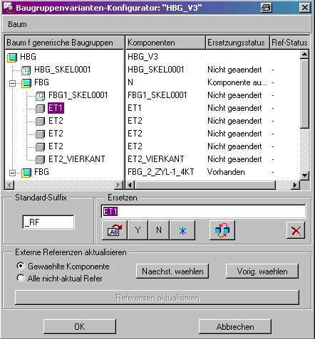 Wenn Du im generischen Teil eine neue BG Variante erzeugst, werden die Komponenten mit "Y" dargestellt. Oeffne direkt aus der Fam-Tab die entsprechende Variante und ersetze die gewünschte Komponente (Teil-Variante) mit "Ersetzen" "über Fam-Tab". Wenn Du nun wieder zur generischen BG wechselst, so ist die entsprechende Variante namentlich eingetragen.  Dies hab ich per Zufall, und nicht per Aufbaukurs gelernt...    Gruss Thomas Eine Antwort auf diesen Beitrag verfassen (mit Zitat/Zitat des Beitrags) IP |