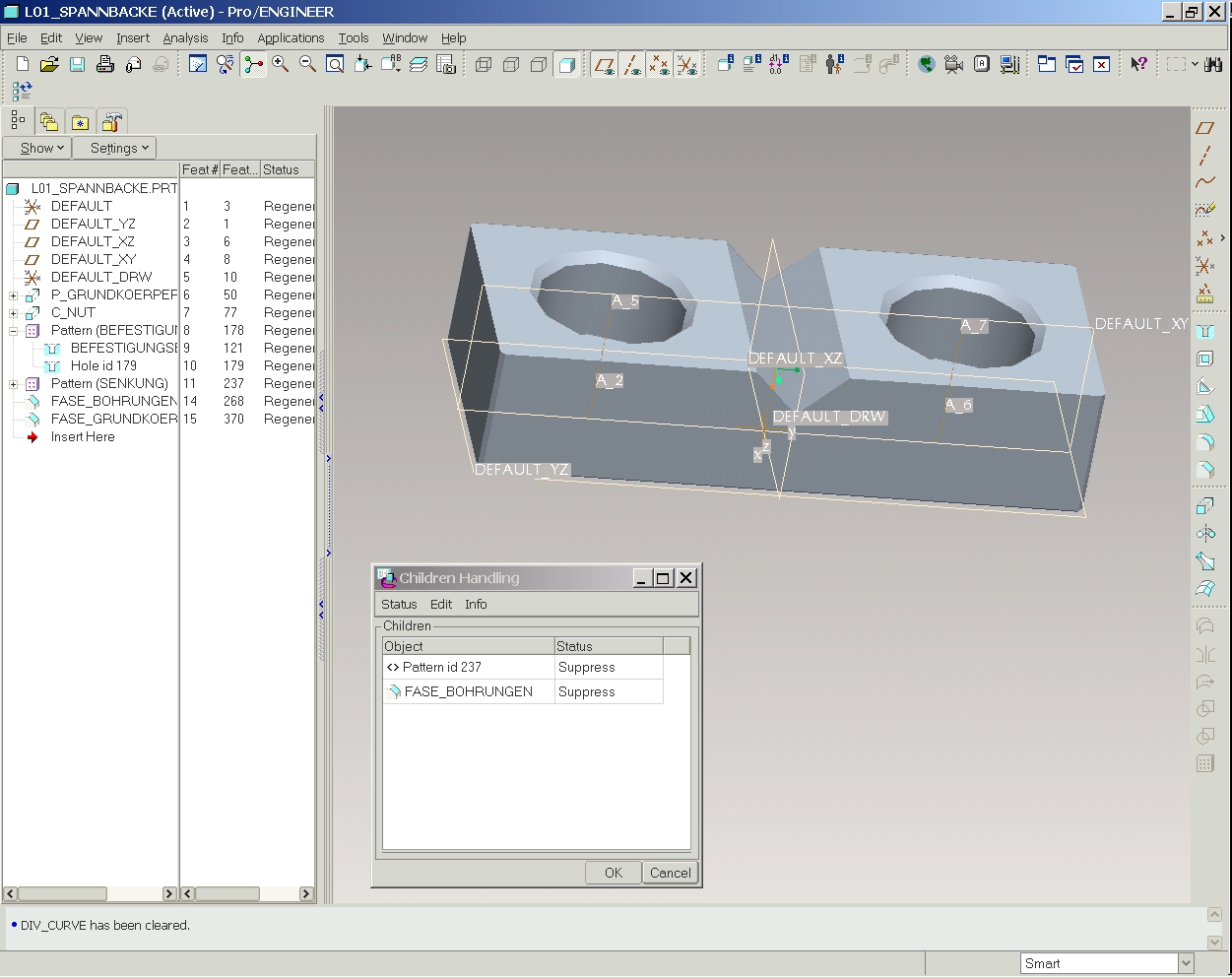 Es gibt da auch noch das Trimmenü. Man kann sich alte Refs anzeigen lassen und neu definieren. Ansonsten gibt es einige kleine Unterschiede zwischen Modellbaumaktionen und Menüfolgen die zwar gleich aussehen aber unterschiedlich agieren (cbernuth). Löschen/unterdrücken im Modellbaum heisst löschen/unterdrücken aller Kinder. Leider, so können nicht die Kinder umreferenziert werden. Eine Antwort auf diesen Beitrag verfassen (mit Zitat/Zitat des Beitrags) IP |