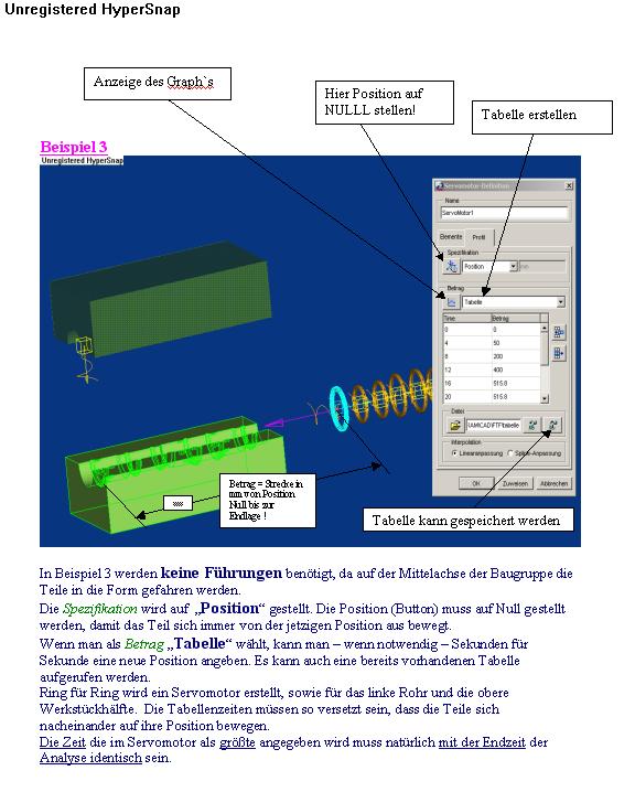 die Anleitung ist für 2001 wie ehlers bereist sagte: schubgelenk beachte bitte die ganzen anmerkungen am anfang, mechanism ist in einigen dingen etwas "empfindlich" also: teil mit verbindung "schubgelenk" einbauen, achse auf achse, ebene auf ebene die die bewegung nicht einschrängt. mit bewegen auf ausgangspunkt schieben. mechanism >modell> servomotor >nullpunkt einst. >und am besten mit "position" und "tabelle" arbeiten -aus meiner docu: In Beispiel 3 wird die Bewegung mit „Position“ definiert, d.h. zu einem Zeitpunkt X (in Sekunden) befindet sich das Teil an Punkt Y (in mm). Man kann das als Tabelle darstellen und so unterschiedliche Teile zu verschiedenen Zeitpunkten loslaufen lassen. WICHTIG: Nicht vergessen die Ausgangsposition auf Null zu stellen! ____________________ die endzeit in der analyse muss der höchsten zeit im servomotor entsprechen. wenn du noch nicht klarkommst mail mir ich geb dir meine nr und helfe online bis dann kerstin ------------------ Wer fragt ist ein Narr für fünf Minuten. Wer nicht fragt, ist ein Narr für ein ganzes Leben Eine Antwort auf diesen Beitrag verfassen (mit Zitat/Zitat des Beitrags) IP |