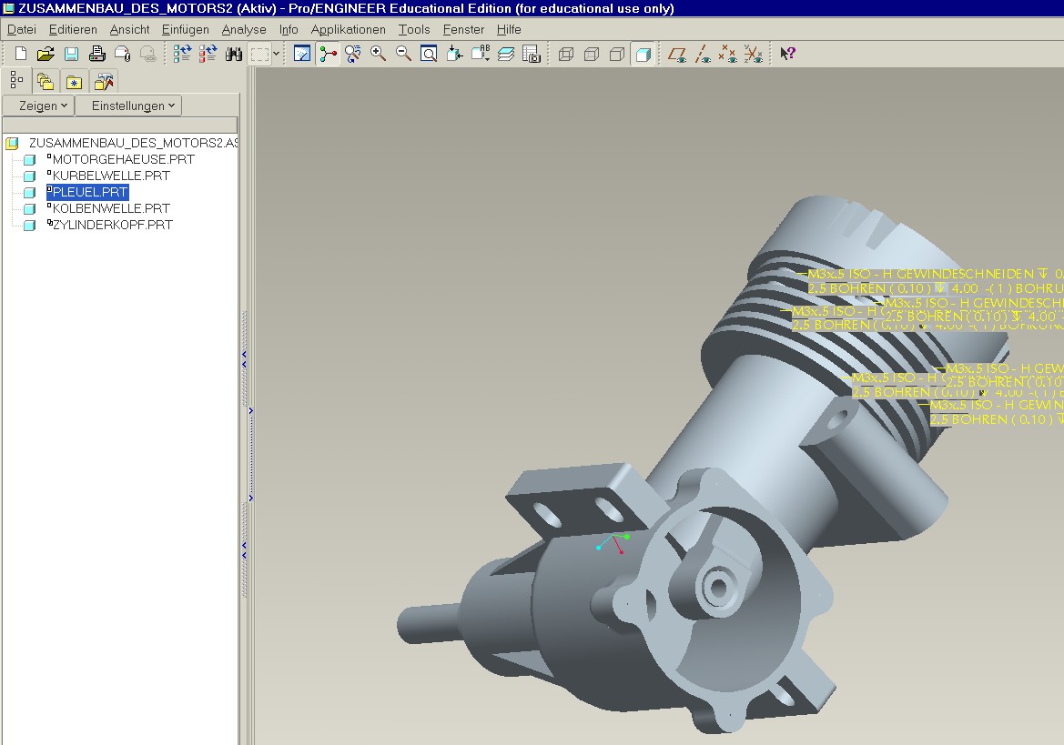 Dazu 2 Achsen und 2 Ebenen wählen Danach verbindest du Pleuel mit Kurbelwelle ebenfalls über Verbindungstyp Drehgelenk. Danach verbindest du Kolben mit Pleuel über Verbindungstyp Zylinderlager. Dabei werden nur 2 Achsen benötigt. Zum Schluss verbindest du den Kolben noch mit der Laufbuchse die du vorher eingebaut haben solltest (logischer Weise) Und zwar mit dem Verbindungstyp Schubgelenk. Unterwegs solltest du dich nicht darüber wundern das die Teile eigentlich unterbestimmt sind und wirr im Raum liegen. Das macht Pro/E zum Schluss automatisch. Wenn du anschliessend auf Mechanism klickst kannst du mit der Funktion ziehen die komplette Mimik mit der Maus bewegen. Nicht vergessen - Oberste Regel lautet : Pro Verbindung immer nur 2 Teile referenzieren sonst klappt es nicht. Wenn du das ganze über Maße bewegen willst, kanst du die Kurbelwelle auch wie oben beschrieben einbauen. ------------------ Bis denne Die Antwort liegt irgendwo da draussen. Eine Antwort auf diesen Beitrag verfassen (mit Zitat/Zitat des Beitrags) IP |