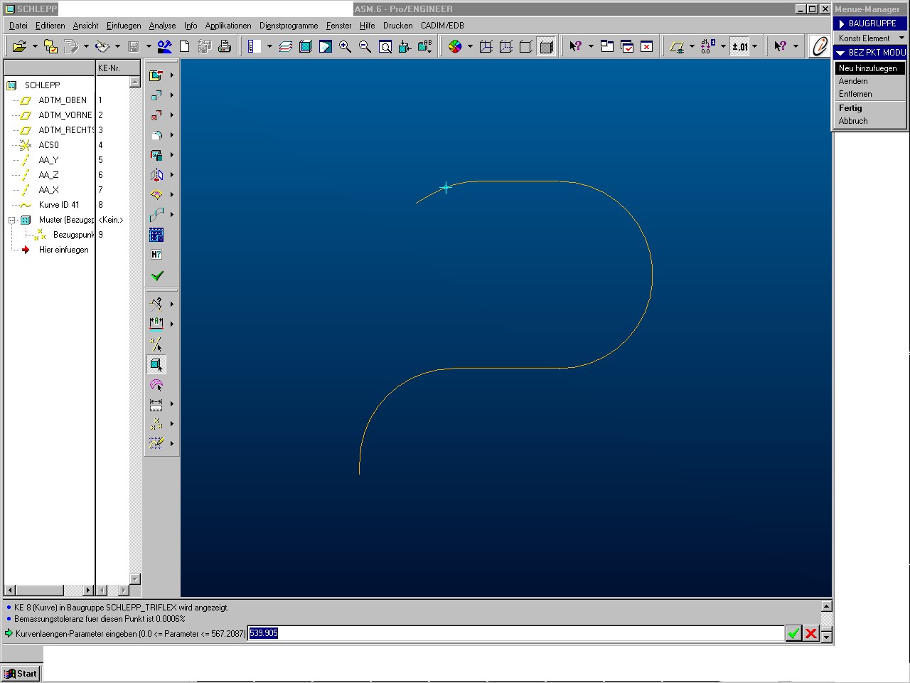 ... also das problem kam schon richtig rueber. du moechtest die wahre laenge entweder von der einen seite oder von der anderen seite eingeben. von welcher seite das mass gesetzt wird, fragt pro/e aber nicht ab, ein startpunkt kann im skizzierer bei kurven auch nicht gesetzt werden und die skizzierreihenfolge ist auch egel. deshalb wohl oder uebel willkuer des systems. ich weiss nicht mehr, aber vielleicht jemand anders oder in neueren version ab wildfire geht es noch anders. ... so long