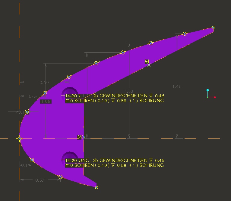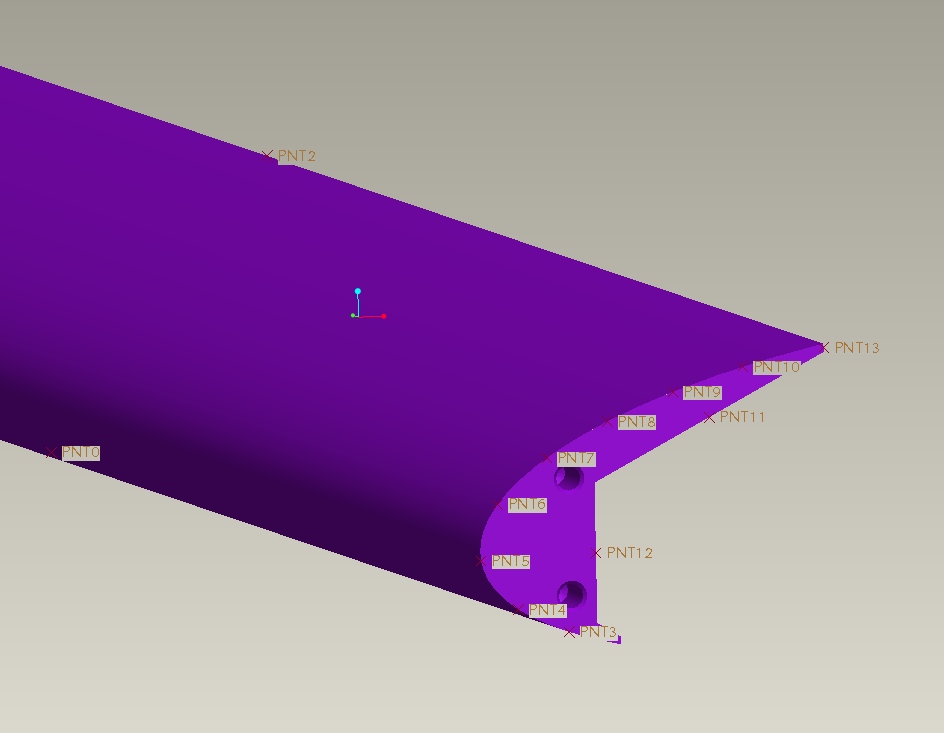 , ich habe da ein (hoffentlich nur für mich) kniffliges Problem: Auf der Freiformfläche des Tragflügels sollen Druckmessbohrungen angebracht werden (grob wo die Punkte an der Aussenkante angezeigt sind). Die Bohrungen sind auf einer Ebene, die schräg zur Seitenwand verläuft - die Punkte sind also die auf die Seitenwand projezierten Positionen der Bohrungen. Nun habe ich das Problem, dass ich zwischen den projezierten Positionen immer dieselbe Kurvenlänge benötige. Geht das in Pro/E Wildfire? Ich dachte ich erzeuge die Punkte auf beiden Seitenwänden, verbinde jeweils zwei Punkte mit einer Hilfslinie, erzeuge einen weiteren Punkt im Schnittpunkt der Hilfslinie mit der schiefen Ebene und plaziere dort eine zur Fläche senkrechte Bohrung. Geht das einfacher? Vielen Dank für Eure Hilfe!! maschimaen Eine Antwort auf diesen Beitrag verfassen (mit Zitat/Zitat des Beitrags) IP |