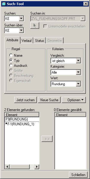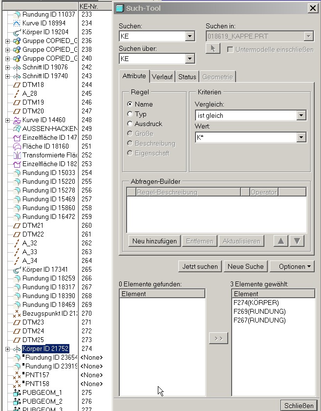 hallo, hast du im "Such-Tool"-Fenster bei "Optionen" auch "Unterdrückt" aktiviert? (Haken muss gesétzt sein?!) Gruss Jürgen Nachtrag: Die gefundenen Elemente werden nur im rechten Fenster angezeigt, sprich in dem Fenster für die gewählten(nicht gefundenen) Elemente. Aber es funktioniert definitiv auch mit Systemnahmen "Bohrung" "Koerper" usw. Event. gibt es ein Bug mit der neuen Benennung der Elemente, ich hatte es jetzt an einem Teil aus der Version 2002 in WF-2 getestet. ------------------ [Diese Nachricht wurde von war ich das etwa am 14. Apr. 2005 editiert.] Eine Antwort auf diesen Beitrag verfassen (mit Zitat/Zitat des Beitrags) IP |