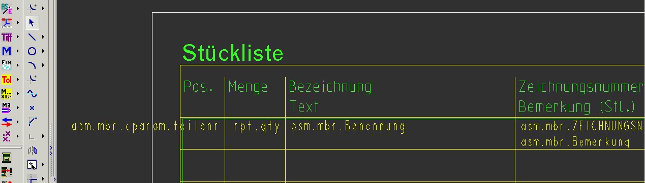 Morgen, okay, hab den Wiederholbereich hinzugefügt und die Berichtssymbole definiert. rpt.index: klappt asm.mbr.BEZ1: er listet mir die komponenten auf, jedoch alle einzeln. Wenn eine Komponenten mehrfach eingebaut ist, erzeugt er also für jede eine neue Reihe. rpt.qty: in der Spalte steht leider gar nüx... desweiteren sind immer wieder leere Reihen zwischendrin... was da los? Bin nach der Pro/E-Hilfe vorgegangen... Kann bitte einem DAU wie mir jmd. erklären wie's denn richtig geht? Danke & Gruß, docci