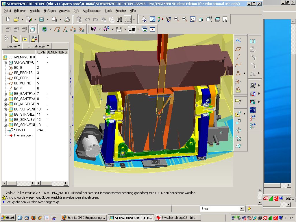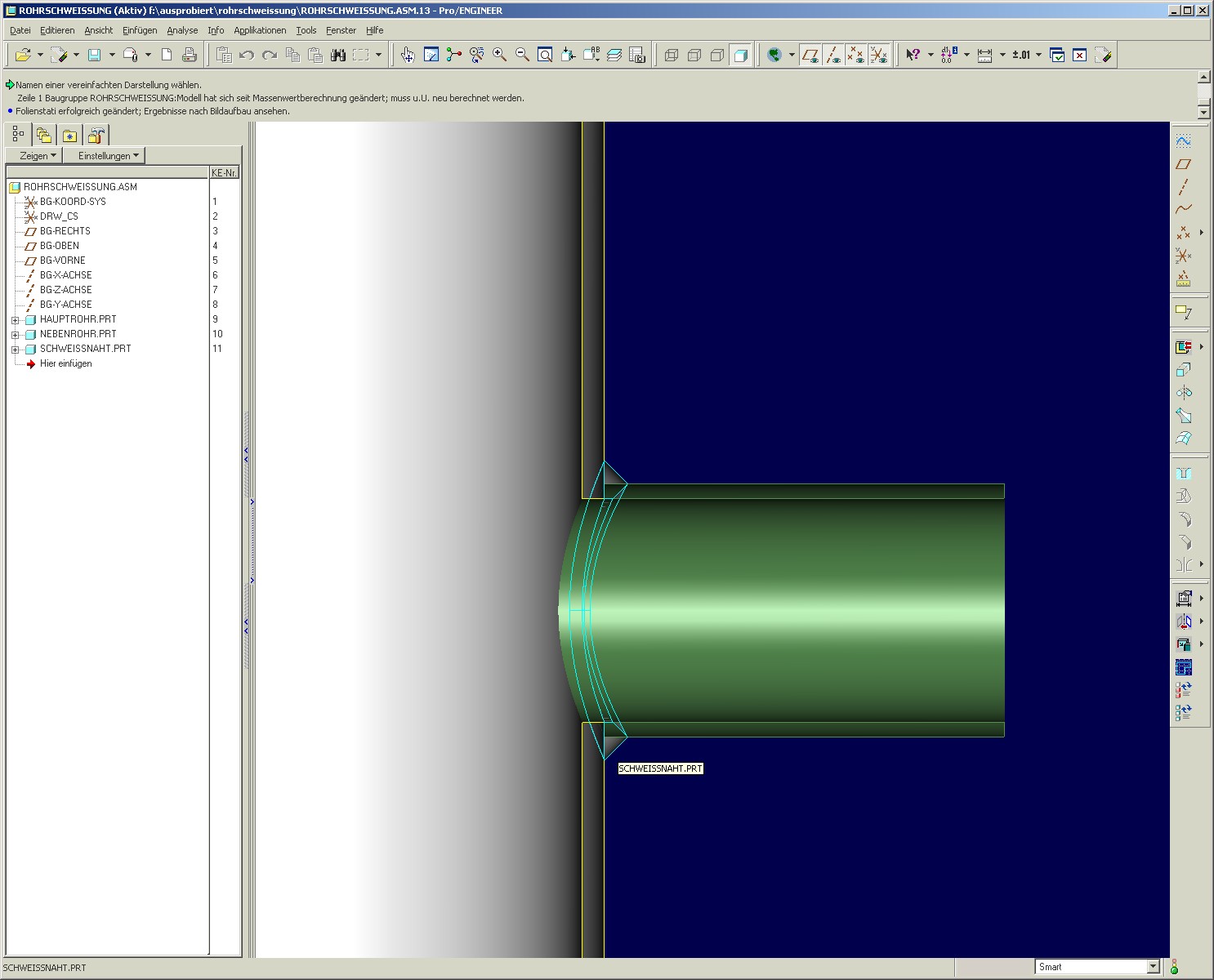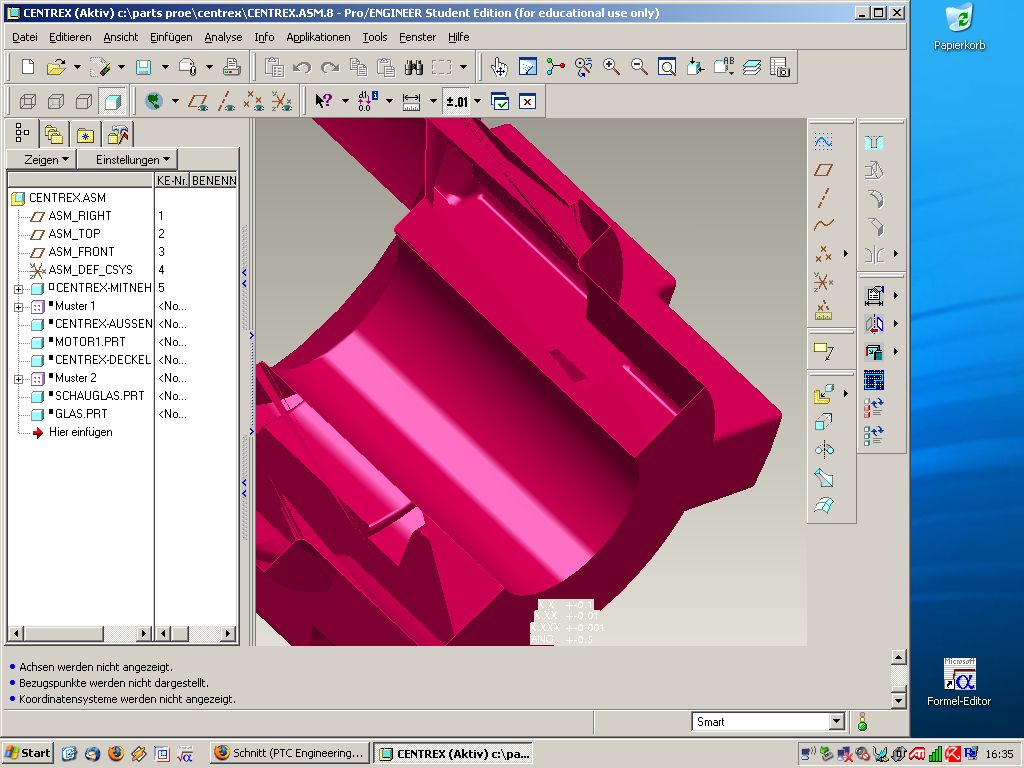 Hallo Mestro! Bin auch Studi, werd mir das Ding mal anschauen. Die Darstellungsfahler im 3D sind völlig normal, das liegt weder an dir noch an deiner Graka. Musste ich auch schon feststellen. Im 2D sollte der Schnitt aber völlig in Ordnung sein. Ich schau jetzt mal rein und dann meld ich mich nochmal  Gruß Seppel SO, NACHTRAG: Habs mir jetzt mal angeschaut, kann dich beruhigen. Bei mir siehts genau so aus, zudem hab ich mal n Beispiel von meiner momentanen "Nachtarbeit" (Bild3) hinzugfügt. Auch da sieht der 3D-Schnitt nicht so toll aus, es kommt aber auch auf die Position an. Manchmal funktionierts sogar, dass der Volumenkörper auch so aussieht, wie er im Schnitt aussehen soll. Ich sag jetzt mal Grafikfehler vom Pro/E  Zum "sagt mir, was in der Konstruktion schlecht ist oder was man besser machen kann": Ich hab gesehen, dass bei dir Teile nicht sauber referenziert sind, d.h. du hast die Teile einfach so in den Raum gehängt ohne fixen Punkt. Das sieht man sehr gut an den schönen kleinen Rechtecken vor den KE´s. Unser Prof meinte, wenn ein Teil nicht sauber referenziert ist, gibt´s null Punkte. Korrigier mich bitte, wenn du das ganze mit Absicht gemacht hast oder nur mal auf die Schnelle reingebastelt hast. Das "in den Raum hängen" mag bei einfachen BG´s noch funktionieren, aber wenns komplexer wird, dann hilft nur sauberes Referenzieren oder eben ein Skelett, wie es auch in meinem Beispiel im Teilestamm ist. Dadurch hast du die Möglichkeit, gemeinsam benutzte Ebenen über eine Publiziergeometrie in anderen Unterbaugruppen zu vererben und du referenzierst eine Unterbaugruppe (bei mir BG_fksjdhf) einfach auf Standardposition in der Hauptbaugruppe. Du hast dann für die einzelnen Komponenten in der Unterbaugruppe schon die Referenzen aus der Hauptbaugruppe und hast dann weniger Ärger, wenn du mal was ändern musst (="Hassfenster" taucht sehr selten auf). Wenn du allerdings irgendwie alles auf andere Komponenten referenzierst, dann kann es halt vorkommen, wenn du mal ne Komponente änderst, dass deine KE´s, die von dieser Komponente abhängen, alle Referenzen verlieren. Ein Skelett aufzubauen dauert zwar, aber ständig Komponenten neu zu referenzieren dauert sicher länger  Bei mir sind insgesamt ca.500KE´s drin (mit Normteile), da ist die Gefahr eben groß, dass was schief geht. Mit dem Skelett hast du ein Gerüst, das alles am Platz hält, egal was andere Komponenten machen. Zudem hab ich das Gefühl, dass du ohne Startup-Tools arbeitest. Da du eine Studi-Version von Pro/E hast, kannst du die Tools kostenlos von Inneo runterladen. Bietet den Vorteil, dass du Normteile hast (mehr als aus Pro/E selber) und zudem auch schon von Anfang an eine Materialzuweisung hast und zusätzlich auch in mm arbeitest. Wenn du keine STools hast, meld dich halt, dann such mal den Link. So, das wars mit der Kritik Nicht krumm nehmen, nur so lernt man was. Gruß Seppel