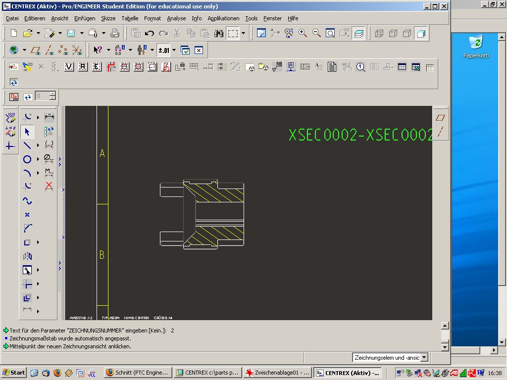 @Mestro: Aufgrund Deiner Antwort gehe ich davon aus, daß Du zumindest schon eine Zeichnung des ungeschnittenen Bauteils hinbekommst. Um eine bereits platzierte Ansicht in eine Schnitt-Ansicht umzuschalten gehst Du wie folgt vor: (Wildfire 2) - Ansicht mit LMT markieren, RMT => Eigenschaften - => Schnitte => 2D-Querschnitt, dann auf das grüne "+" und den gewünschten Querschnitt auswählen. - fertig! Vorher mußt Du dafür im Ansichtsmanager den gewünschten Querschnitt definieren und speichern. Ich hoffe das ist ausreichend! Gruß