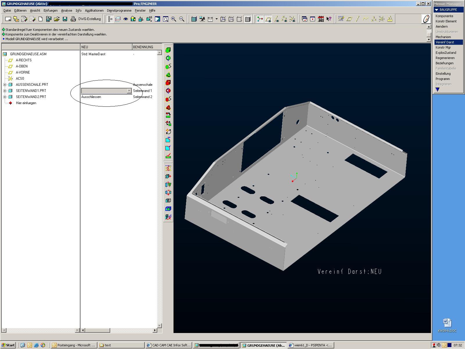 Hallo Forumsmitglieder, bin neu hier in diesem Forum, aber schon länger ein ProE-Anwender. Die Suche kann ich leider nicht benutzen da das Internet zum Teil gesperrt wird von unserer Firma. Folgendes Problem: bei meiner alten Firma konnte ich im Modellbaum direkt eine vereinfachte Darstellung umdefinieren (Komponente Ausschließen, Standard,...), jetzt geht das nicht mehr (Feld is grau hinterlegt)? Weiß vielleicht wer welche Einstellung das ist? ------------------ Gruß, Chris Eine Antwort auf diesen Beitrag verfassen (mit Zitat/Zitat des Beitrags) IP |