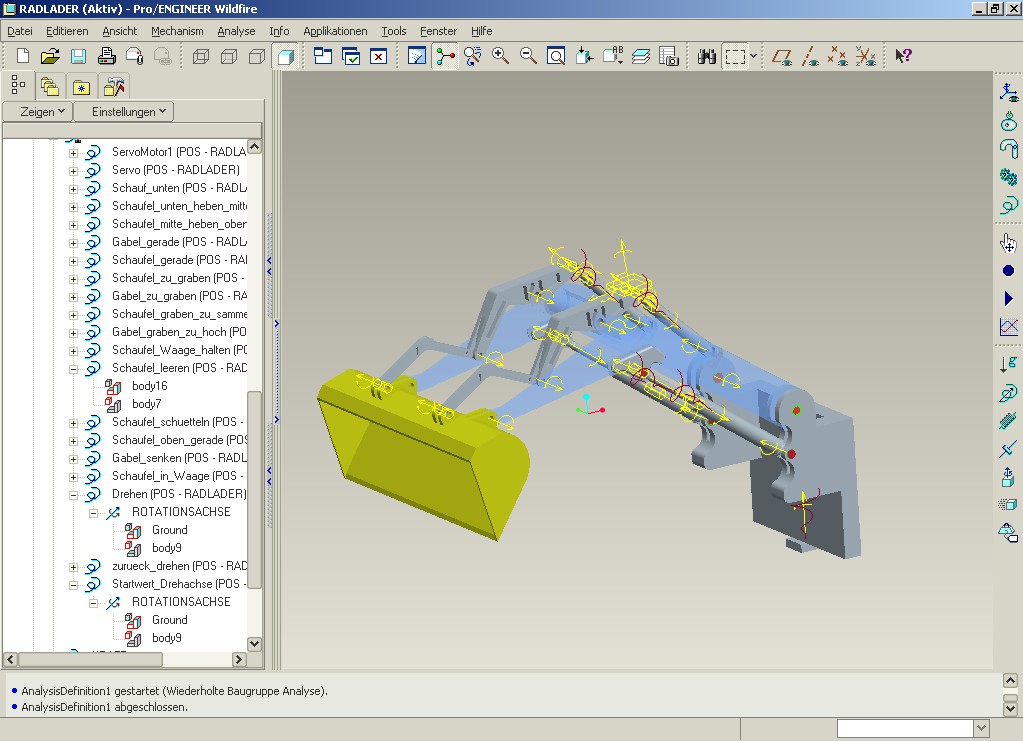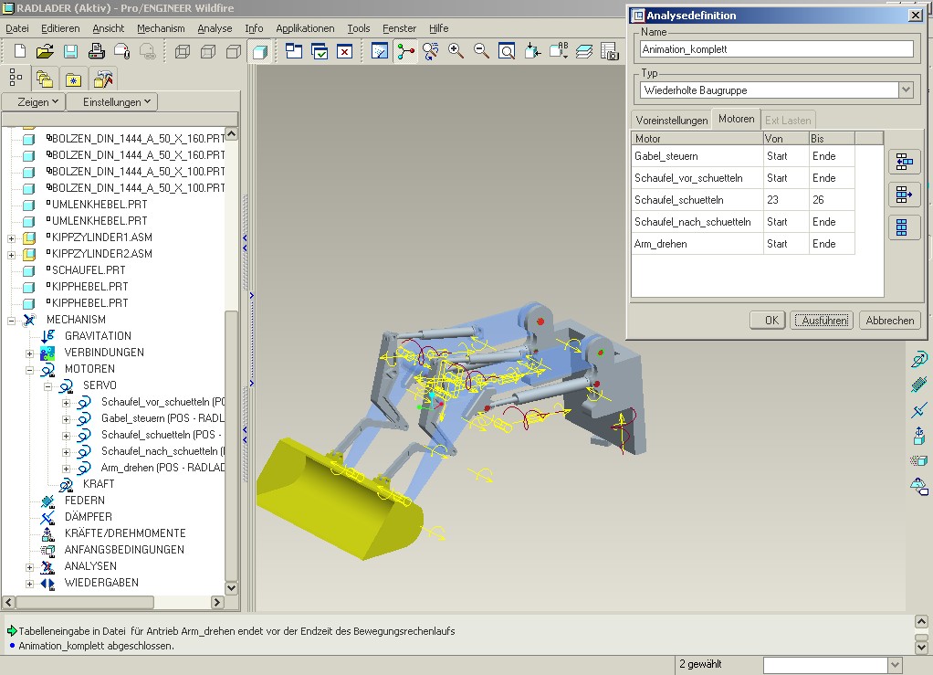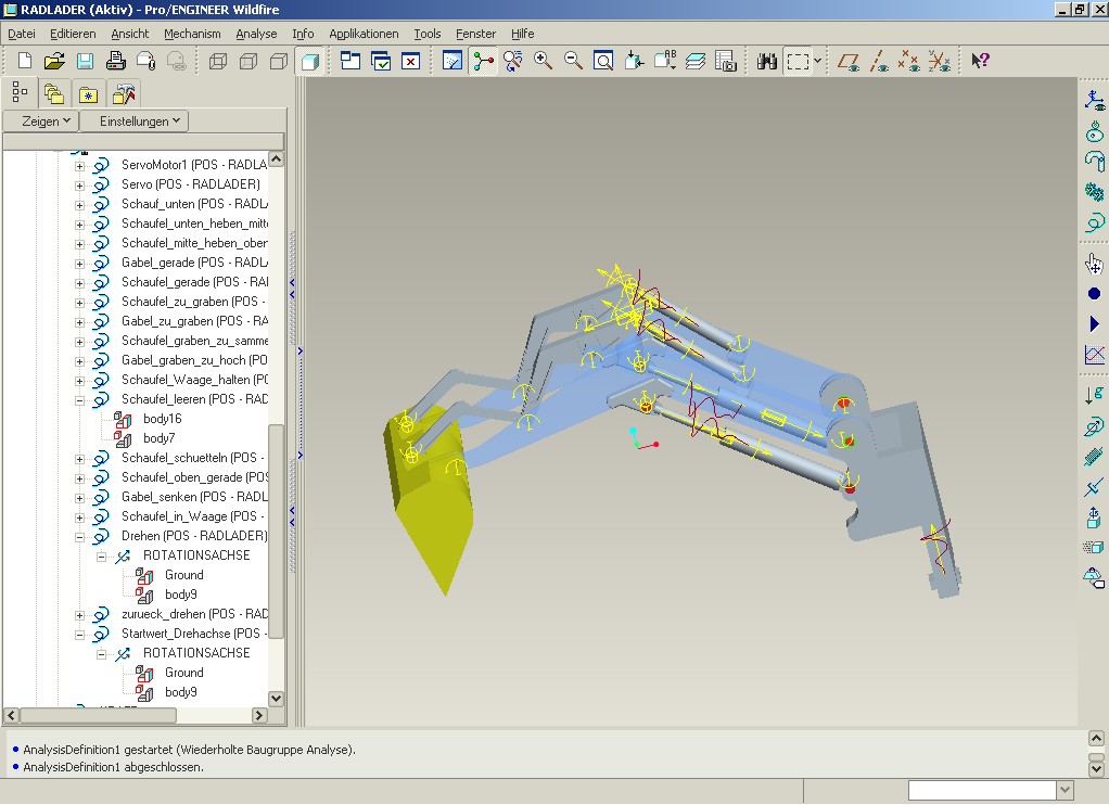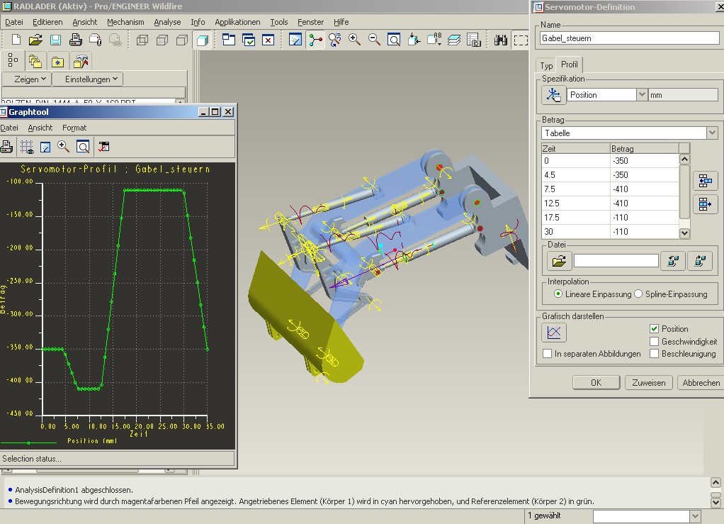 Soweit ist alles komplett und läuft auch. Ich habe die Schaufel über einen einzigen Motor gesteuert. Die positionen laufen über eine Tabelle. Um dann die Kosinus-Funktion einbauen zu müssen, muss ich jedoch einen neuen Motor generieren, der auf die gleiche Linearachse zugreift, ist das richtig? Ich kann ja nicht die Bewegungen in der Tabelle für die volle Animationsdauer einstellen und dann in einem gewissen Zeitfenster mit der kosinus-funktion überschreiben. Da tritt dann doch ein Randbedingungskonflikt auf. Also habe ich es nun so gemacht: Gabel - Volle 60 sec über einen Motor und Tabelle definiert. Schaufel - bis 30 sec über einen Motor und Tabelle definiert. Schaufel von 30 bis 35 sec über zusätzlichen Motor und kosinus definiert Schaufel von 35 bis Ende über weiteren Motor und Tabelle definiert. Somit erreiche ich 4 Motoren für den gesamten Bewegungsablauf, plus noch einen, wenn ich später den ganzen Arm noch einmal um 180 Grad drehen will. (schaufelt von rechter Monitorseite einmal auf die linke) Um die definierung der Schaufel über 3 Motoren werde ich wohl nicht drum herum kommen, oder? Kann ich da nicht ein und denselben Motor nutzen und diesen einfach zu bestimmten Zeiten auf bestimmte Funktionen oder tabellenwerte setzen? Das wäre dann am schönsten. Alles mit 3 Motoren. Wäre sehr dankbar für die letzte Hilfe. Ich glaub ohne euch hätte ich da noch Tage dran gesessen und mir ein noch so kompliziertes Gebilde zurecht gebastelt. Anbei noch einmal ein Bild der momentanen definitionen. Eine Antwort auf diesen Beitrag verfassen (mit Zitat/Zitat des Beitrags) IP |