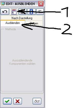 Hallo! Siehe Bild im anhang: Zum einblenden mußt du zuerst Punkt 1 anwählen, dann das Teil oder die Baugruppe wählen. ( Du setzt damit das Teil oder die BG wieder zurück, heißt es wird wieder eingeblendet) Punkt 2 ist die Registerkarte zum ausblenden, aber das weißt du ja Wenn du nur Teile einer BG ausblend willst, darst du vorher nicht die BG ausblenden! Du könntest über die Schlatfläche ganz rechts auch eine Regel definieren die sagt welche Teile ausgeblendet werden sollen. (z.B. soetwas wie: alle Teile die kleiner sind als 100mm) Gruß Harlekin Ich hoffe das hilft erstmal Gruß Harlekin