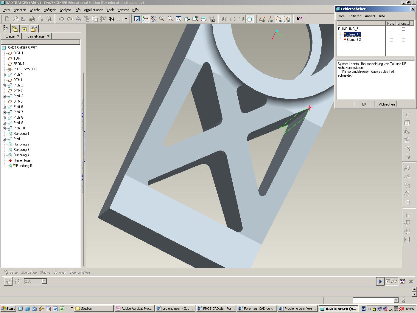 Hallo, schon mal mit verschieden großen Radien versucht? Bei Rundungen gibt es keinen Königsweg. Hier hilft oft nur probieren. Im Zweifel Rundung in die Zkizze packen. Sieht mir auch so aus, dass der vorhanden Radius am Kragen grad hier ausläuft. Dies könnte das Problem sein, da hier zu kleine Flächen entstehen (Genauigkeit). Vielleicht auch einfach diesen Radius verschieben nach Deinem Problemfall. ------------------ Gruß aus dem Norden |