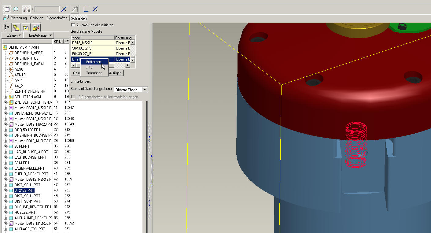 Hallo zusammen, folgende Frage habe ich zu Querschnittsdarstellungen im 3D-Modus: Wenn ich wie schon in einem anderen Beitrag beschrieben, einen Querschnitt in einer Baugruppe erzeuge und dann eine Komponente ausschliessen will klappt das super in der Zeichnungsebene. Wie schaffe ich das aber in der 3D-Ebene? Da ist immer alles geschnitten! Wer kann mir helfen? Viele Grüße Matthias Eine Antwort auf diesen Beitrag verfassen (mit Zitat/Zitat des Beitrags) IP |