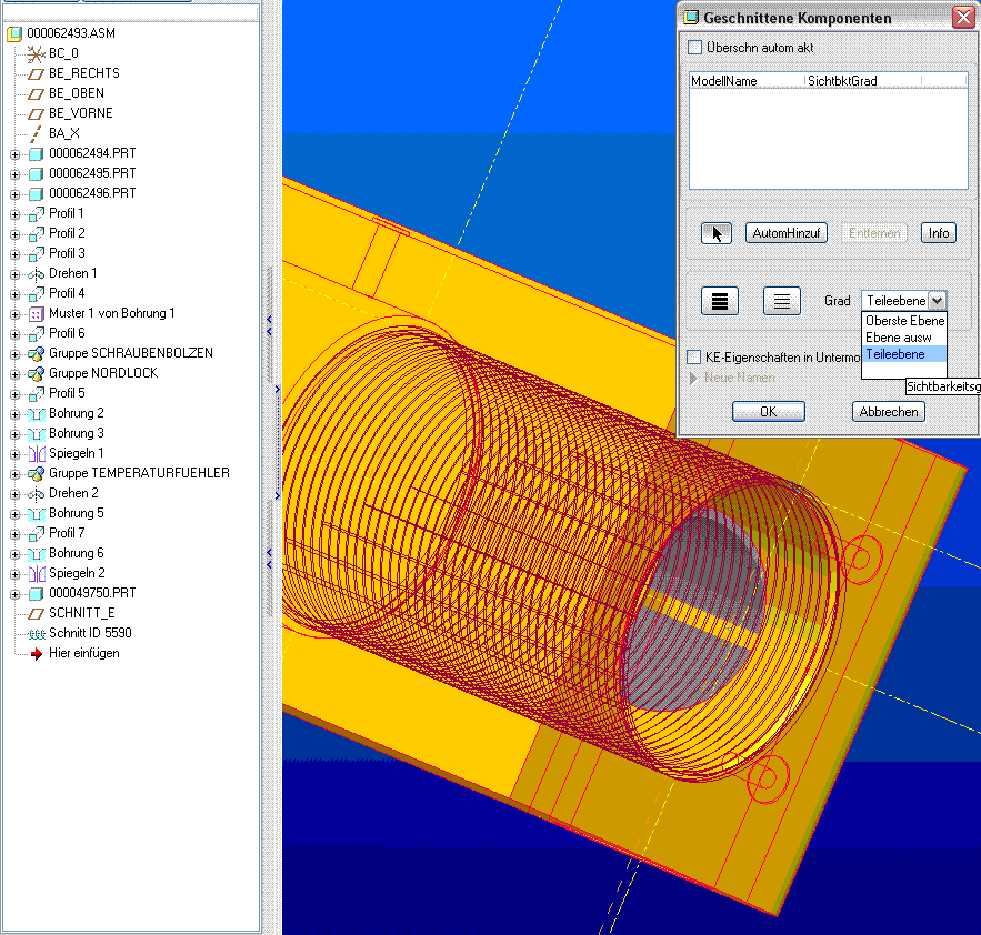 Hallo, -Schnitt muss nach dem Einbau der Komponenten erfolgen -zu schneidende Teile definieren -definieren, ob Schnitt auf Teilebene sichbar sein soll ------------------ Gruß aus dem Norden |