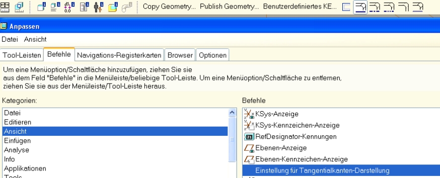 Also das mit den Tangentialkanten-Einstellung gibt es in der WF3 (Siehe Bild). Einfach den markierten Eintrag irgendwo in die Leiste oben schieben und die Icons erscheinen automatisch wie rechts oben zu sehen ist. Zugegeben: Ein wenig blöd umschrieben und nicht gerade gut zu finden, aber es ist noch da. Zu dem anderen: Habe heute leider keine Zeit mehr, danach zu suchen. ------------------ Grüße aus OWL, Thomas CAD.DE macht Spaß! Wichtige Links für noch mehr Spaß: Richtig Fragen - Nettiquette - Suchfunktion - System-Info - 7er-Regel - Unities ProE macht Spaß - viel ProE macht viel Spaß ! (Zitat, frei nach meinem ProE-Beibringer) Eine Antwort auf diesen Beitrag verfassen (mit Zitat/Zitat des Beitrags) IP |