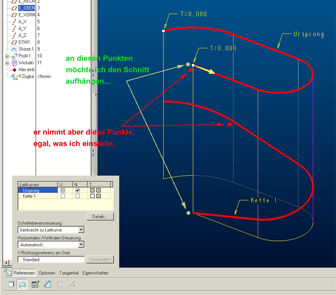 Moin Pro/Fis, ich stehe irgendwie auf dem Schlauch: an den zwei Kurven soll ein variabler Schnitt langlaufen. Dieser steht senkrecht zur oberen LK. Die Höhe soll von der unteren Kurve gesteuert werden. Wie bekomme ich hin, dass ich die "grünen Punkte" als Skizzenreferenz kriege? Pro bietet mir immer nur die "roten Punkte" an. Danke für eure Tips! Felix ------------------