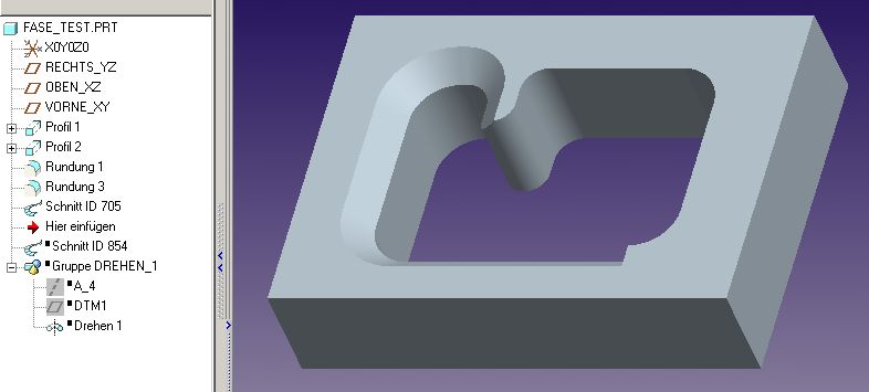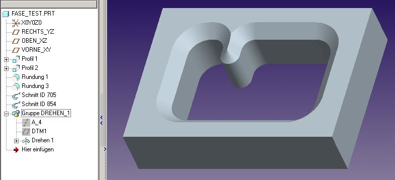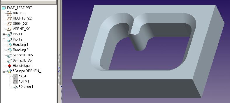 Hallo die Fase rundum soll größer sein als die Dicke der Einbuchtung, sodass diese an beiden Seiten angefast wird. Klar wenn die Einbucht 10mm dick ist und die Fase 6x45° so "fehlt" die Oberkante komplett also die Einbuchtung wird Spitz und etwas in der Höhe gekappt- geanu das will man. Proe lässt aber in der Fase keine Überschneidung zu (auch nicht als Zug KE) In der Praxis: man fährt mit einen 90° Kegelfräser der Kante entlang und fräst weg. Nun möchte man noch die Fasegröße variieren, ich denke das bekomme ich hin mit Zug KE mit variablem Schnitt oder weiss jemand was besseres ? Dennoch auch dabei habe ich das Problem sich das Zug Ke selbst überschneidet und komme ins Trimmmenue...