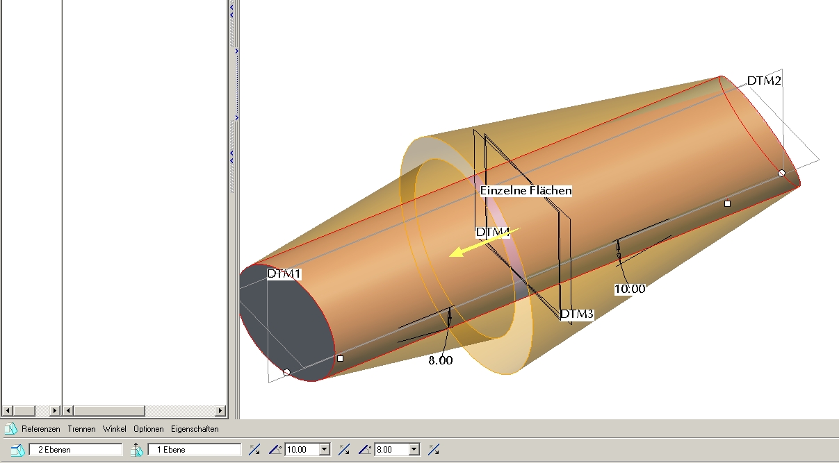 Zitat: Original erstellt von K_H_A_N: @Meike: So etwas hatte ich schon mal gehört, konnte es aber nie nachvollziehen. Ich bleibe bei der Definition des Trennelement hängen. Eine Ebene ist nicht wählbar, eine Skizze mit dem Querschnitt des Körpers lässt sich zwar anfertigen, führt aber dazu, dass die Schräge nicht vervollständigt wird. Geht das mit WF2? und wie muss das Objekt zum Trennen definiert sein?