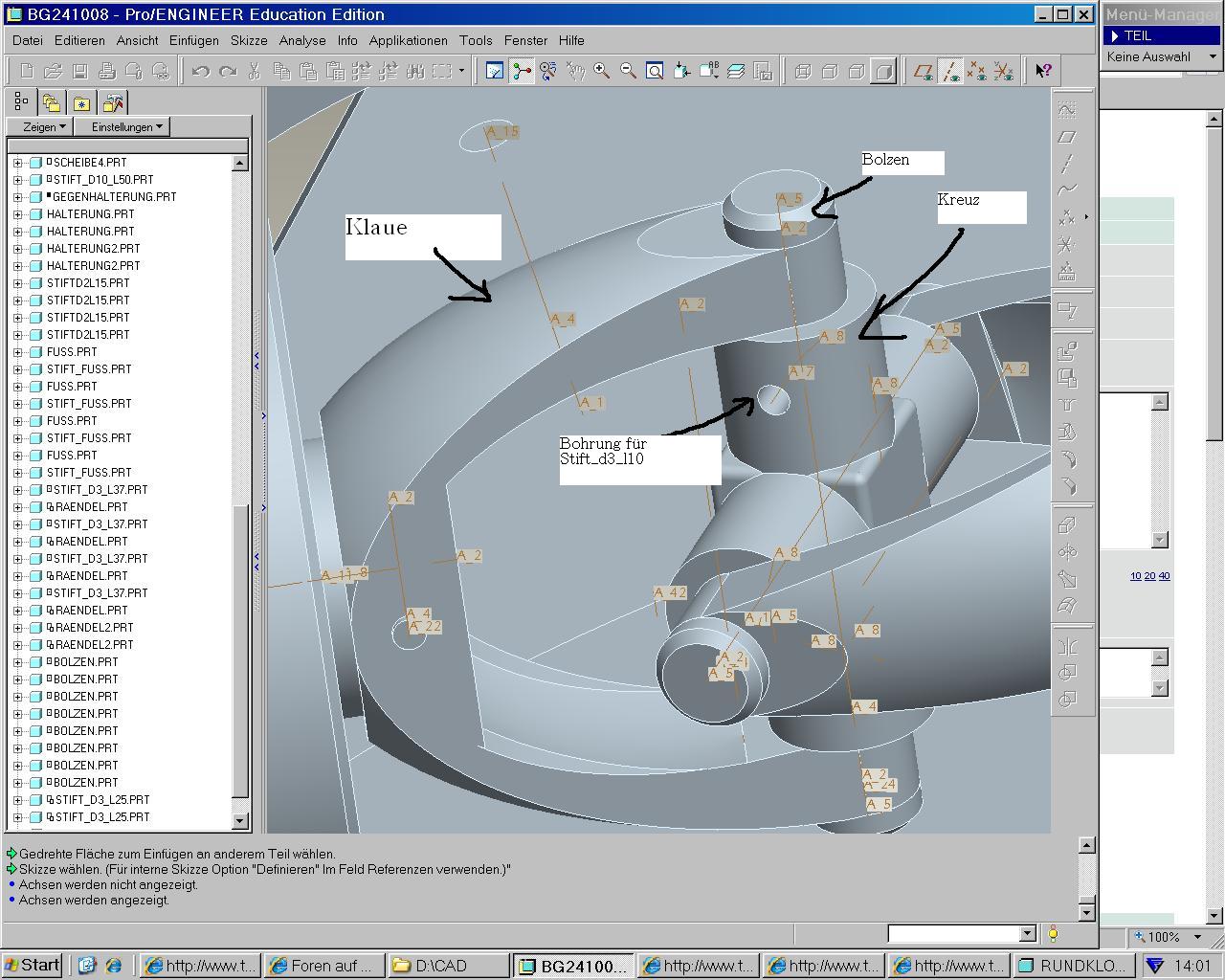 Ich glaube die Stifte, die ihc im ersten beitrag vermutet habe, waren an den Abstürzen schuld. Im Anhang sind 2 Bilder, da hab ich ne Frage wie man's besser machen kann: Die Klauen sind als Drehgelenk mit dem Kreuz verbunden. Die Bolzen habe ich auf die Klauen ebenfalls als Drehgelenk eingefügt. Nun müssen noch die Stifte in Kreuz und Bolzen, damit die Klauen gesichert sind. Da kam dann auf einmal der Fehler! vg Eine Antwort auf diesen Beitrag verfassen (mit Zitat/Zitat des Beitrags) IP |