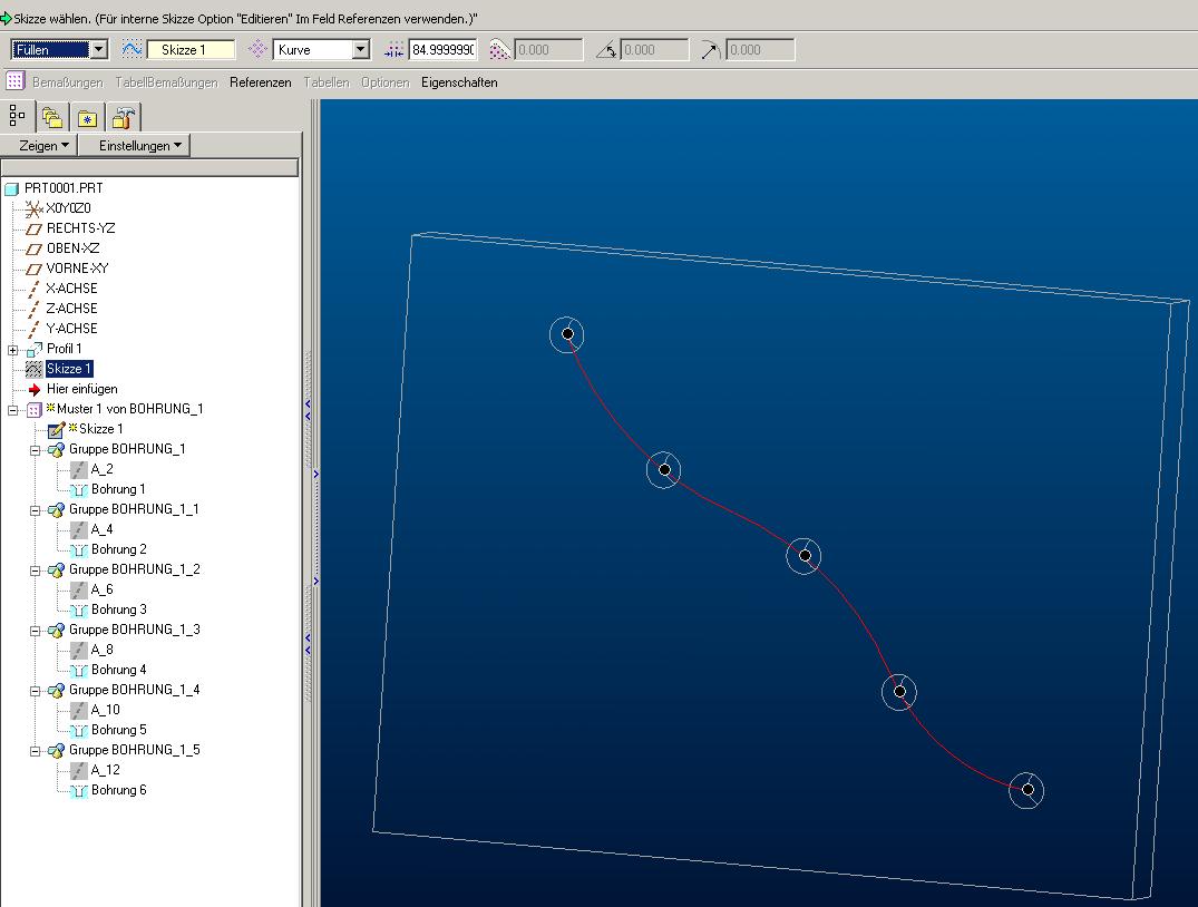 Es gibt auch die Möglichkeit über Füllen --> Kurve. Dafür braucht man dann keine Hilfskonstruktion. Aber da musst du den absoluten Abstand entlang der Kurve eingeben. Es läuft also nicht automatisch über die Anzahl der Bohrungen, aber das ließe sich auch über Beziehungen regeln. Mich wundert gerade nur, dass er mit keine Bohrung auf das Kurvenende setzt, wenn es genau hinkommt. (In meinem Versuch war die Kurvenlänge 340, also der Abstand der Bohrungen 85. Aber er machte mir nur 4 und ließ das Kurvenende frei. Bei 84,999999 machte er es dann.) [edit]Bild angehängt. Sys-Info korrigiert[/edit] ------------------ Gruß Christian [Diese Nachricht wurde von Börga am 08. Dez. 2008 editiert.] Eine Antwort auf diesen Beitrag verfassen (mit Zitat/Zitat des Beitrags) IP |