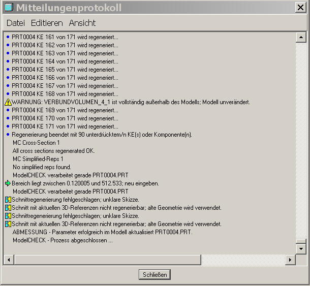 "Nutze Kante" in der Skizze ist aus meiner Erfahrung auch ein ganz grosser Schwachpunkt in der "Regenerierungskette". Meistens (daraus liest man, dass das öfter vorkommt...) genügt es in die Skizze zu gehen und sich zu wundern. Skizze schliessen und gut ist  ... Naja, wenns hilft.. Ich versuche "Nutze Kante" mittlerweile völlig zu umgehen, bestenfalls als "Schleife" oder als "Kette". Mein Workaround: Zwischenschritt mit "Füllen". Klingt komisch, ist aber so: Skizze erstellen (7er-Regel ), Skizze "Füllen", die hiermit erzeugte Fläche in der folgenden Skizze als "Schleife" nutzen. Hierzu nur die FLÄCHE anwählen, keine Kanten. Dieses Prozedere ist absolut schmerzfrei, will meinen die Ursprungsskizze ist abgekoppelt. Da geht man rein, schmeisst alle Linien raus und malt ein Kreis, Dreieck, aus der 7er-Regel eine 70er-Regel machen, wasauch immer... das regeneriert... Edit: auch im Baugruppenmodus lassen sich die "gefüllten Skizzen" prima per Publiziergeometrie weitergeben.. ------------------ Aller hopp, und bis dann ! Der Jensenmann