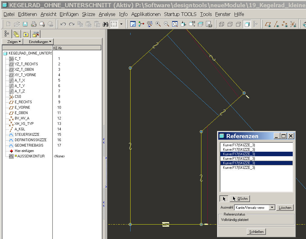 Bei einem komplexen Modell mit sehr vielen Beziehungen und Maßen (Zähler mittlerweile 4-stellig) werden auf einmal Skizzenreferenzen aus "Nutze Kante" nicht mehr aktualisiert, aber auch der dadurch nicht mehr gegebene Referenzbezug nicht als "Not Updated" gekennzeichnet. Im abgebildeten Kegelradbasisbeispiel wird die 3. Skizze Nr. 17: Geometriebasis) über Beziehungen gesteuert. Im konkreten Fall wird die Kontur des Kopfkreises (Außendurchmesser) je nach Bedarf für Konstantmodul (DIN 3971 Bild2, z. B. Gleason) bzw. Kegelmodul (DIN 3971 Bild 1, Normalkegelrad) gesteuert. Die nachfolgende 4. Skizze "Aussenkontur" refernziert auf die Geometriebasis zur Definition des Grundkörpers. Nach einer beziehungsgesteuerten Änderung der Basisskizze, wird diese einfach nicht mehr übernommen (siehe rote Refernzkontur vs. gelbe Skizzenkontur). Trotzdem gibt es keine Fehlermeldung "NOT_UPDATED". Bis vor einigen Änderungen weiter hinten im Modell hat diese Referenzierung anstandslos funktioniert. Jetzt funktioniert es auch nicht mehr, wenn der hintere Bereich unterdrückt wird, Kennt jemand diesen Effekt? Gibt es eventuell eine Maximalanzahl für Maße und Beziehungen?