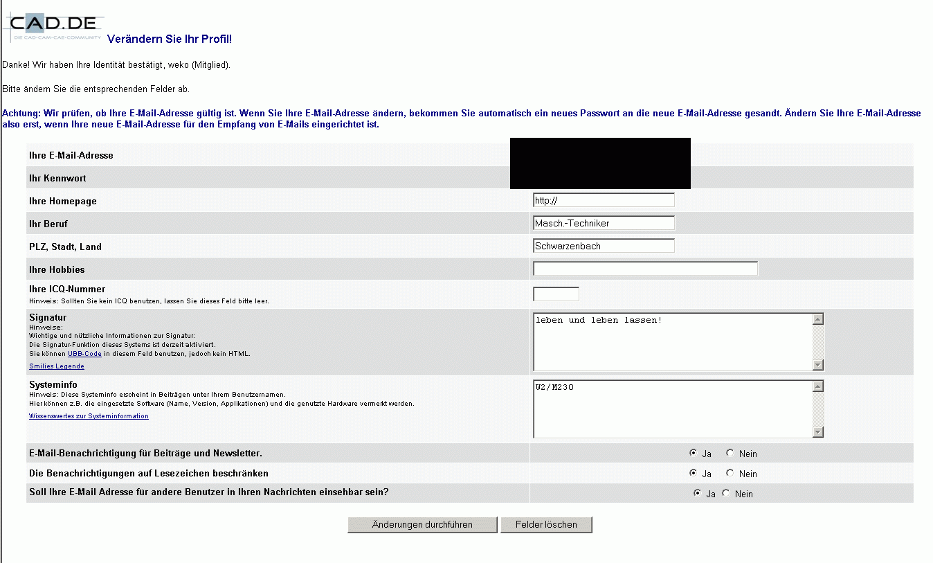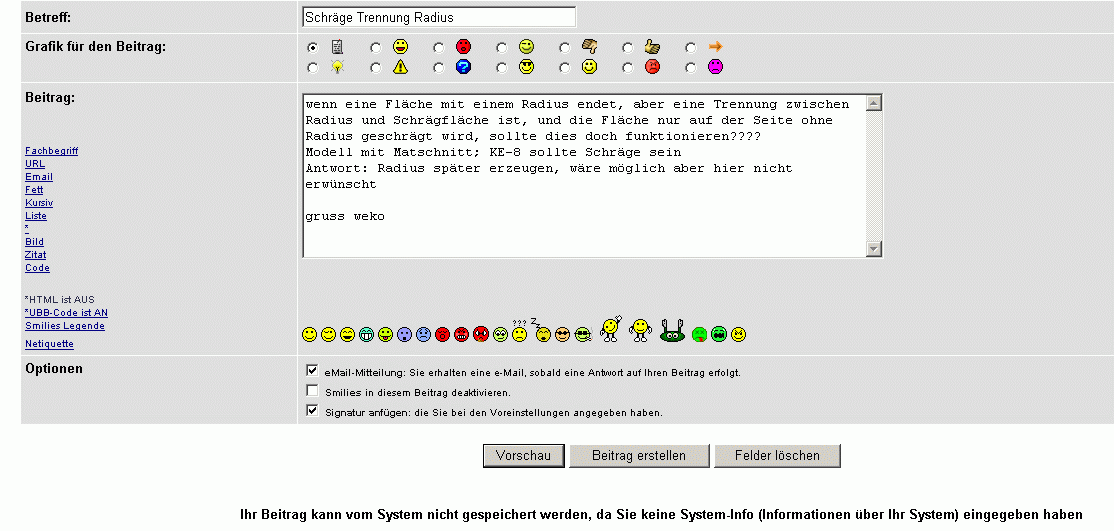 Hallo weko, Du darfst auch gerne "Hallo Meike" schreiben Zu der Sysinfo: Im Profil kann man eine Sysinfo abspeichern, welche verwendet wird, wenn man in einem neuen Forum den ersten Beitrag schreibt. Die Sysinfo, welche Du jetzt hast, steht bei jeder Deiner Antworten unterhalb des Antwortfeldes (wenn Du vor dem Klick auf "Antworten" schon eingeloggt bist). Wenn Du nun dort etwas änderst, gilt die Änderung nur für das ProE Forum. Oberhalb der Beiträge gibt es den Link "Profil ändern". Dort kannst Du deine allgemeingültige Sysinfo eintragen. Ich vermute mal, daß dort im Moment nichts steht und deswegen gemeckert wird. Meike ------------------ Neu hier? Verwundert über manche Antworten?  Wichtige Links für noch mehr Spaß im WBF: Richtig Fragen - Nettiquette - Suchfunktion - System-Info - 7er-Regel - Unities Eine Antwort auf diesen Beitrag verfassen (mit Zitat/Zitat des Beitrags) IP |