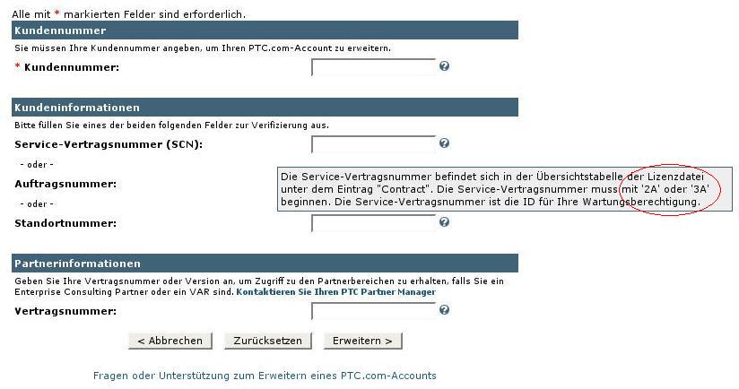 Versuch es mit der 4A... Nummer wenn davor SCN steht. Es wird nichts schlimmes passieren, wenn die Nummer nicht stimmt, im schlimmsten Fall werden Dir halt nur die Grundfunktionen des Accounts freigeschlatet. Warum überhaupt diese Angaben? Die Kundennummer gibt die erste Stufe des Accounts frei, womit man sich schon mal ein paar Dinge ansehen darf. Die meisten uind vor allen Dingen wirklich interessanten Informationen bleiben allerdings den Wartungskunden vorbehalten. Dafür muß man noch die Servicevertragnummer (SCN) angeben. Erst jetzt erhält man Zugang zu den gewünschten Informationen. Aber hier ist zu beachten: Jeder SCN sind die entsprechenden Lizenzen zugeordnet: Gehört die Nummer zu einer reinen ProE Lizenz hat man z.B. keinen Zugang zu Intralink Informationen, oder auch umgekehrt. Meike ------------------ Neu hier? Verwundert über manche Antworten?  Wichtige Links für noch mehr Spaß im WBF: Richtig Fragen - Nettiquette - Suchfunktion - System-Info - 7er-Regel - Unities Eine Antwort auf diesen Beitrag verfassen (mit Zitat/Zitat des Beitrags) IP |