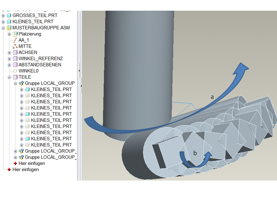 Also ich möchte die kleinen Teile um das große Teil herum Mustern (Winkel a). Dabei sollen Sie sich aber um ihre eigene Achse b drehen.