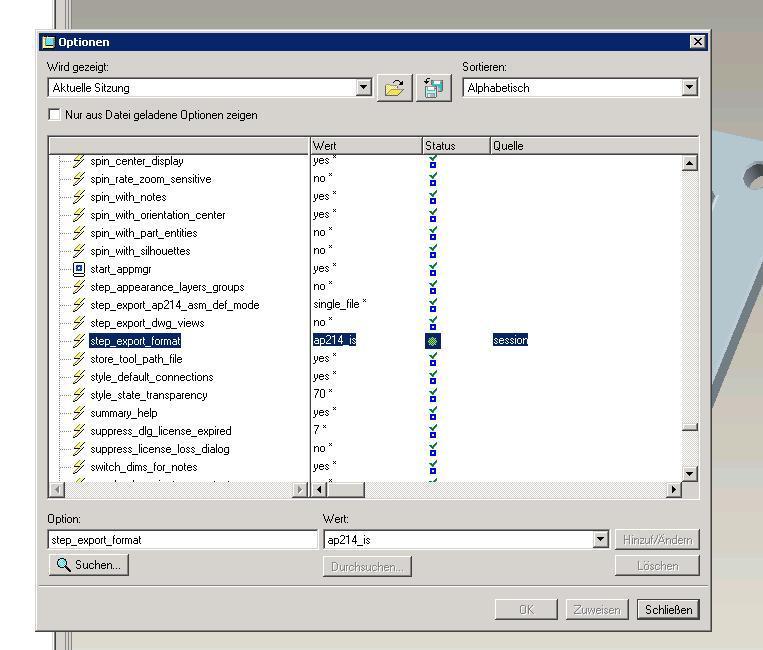@ Johannes: Hab jetzt auch IGES und SAT versucht. Laufzeit etwa 45 min. und dasselbe Problem. Lohnt es sich länger zu warten? Wär kein Problem den Rechner z.B. über Nacht laufen zu lassen... @ anagl: Mit deiner Vermutung liegst du schon ganz richtig. Je nach Ausführung liegt dieses "n" bei etwa 1000... Hab die Einstellung der Config-Option geändert. Hoffe mal dass ich alles richtig gemacht habe, da ich hier bisher noch keine Veränderungen vorgenommen habe. Hab mal nen Screenshot gemacht. Muss ich jetzt noch die Option "Alle Objekte trennen" einstellen oder läuft das automatisch??? Bei einem ersten schnellen Versuch (nur kurz gewartet) hats leider noch nicht die erwünschte Wirkung gezeigt. Trotzdem schonmal Vielen Dank für die schnellen Antworten. Viele Grüße Justin Eine Antwort auf diesen Beitrag verfassen (mit Zitat/Zitat des Beitrags) IP |