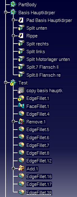 Hallo,wüsste mal gerne ob jemand eine Idee hat, wie ich den Link im angehängten Bild (nur Beispiel, bitte nicht an den gelben Ausrufezeichen stören lassen) durch den Originialbody ersetzen kann, d.h. ich möchte den Basis Hauptkörper mit booleschen Op in den Test Body bringen und zwar vor EdgeFillet.1. Das ist kein Problem, doch der Link (copy basis hauptk) kann nicht gelöscht werden, ohne dass der ganze Test body zerstört wird (alle Fillets und booleschen Op's gehen verloren). Über ein Reorder kann ich den link nicht verschieben und das Add des "Basis Hauptkörpers" kann nicht über den link gebracht werden. wer hat eine Lösung, ohne dass ich die Fillets und booleschen Operationen neu erstellen muss? Gruß, jochen