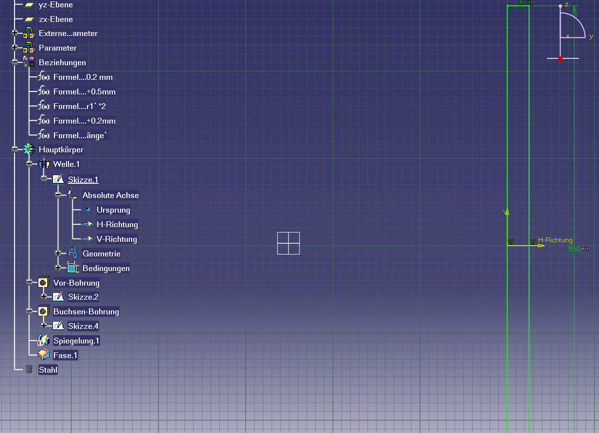 Hallo leo666, so wie ich das sehe, sind alle Bedingungen in Deinem Sketch auf das H-V-Achsenkreuz. Du hast keine Bedingungen auf die Ursprungsebenen. Damit ist Deine Skizze vollständig bestimmt, aber die Position im Teil selbst ist noch frei. D.h., die Welle kann im Part verschoben werden. Dabei geht das H-V-Achsenkreuz mit. Du hast zwei Möglichkeiten: Im Skizzierer die Skizze so umdefinieren, dass die Linien an den Ursprungsebenen hängen. Dazu musst Du dann eben Bedingungen löschen, die auf das H-V-System gehen. Oder Du definiertst Bedingungen im PartDesign (NICHT in der Skizze). Du stzt z.B. eine Kongruenz einer Körperfläche zu einer der Ursprungsebenen.Hoffe das hilft. ------------------ Viele Grüße Jochen Kaestle www.denc.de Eine Antwort auf diesen Beitrag verfassen (mit Zitat/Zitat des Beitrags) IP | | Anzeige: