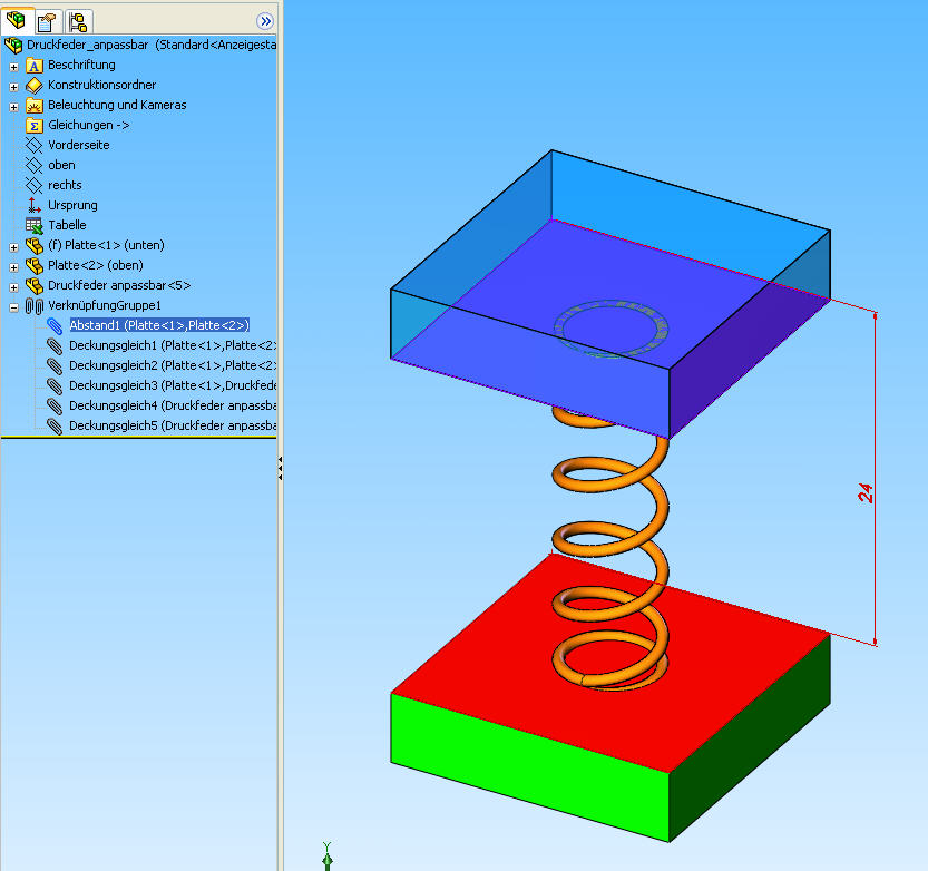 Guude, nur ´ne Idee (die ich schon probiert habe). 1. Man definiert eine Feder (Höhe MUSS ein Parameter sein). 2. in der Baugruppe die beiden Teile (wozwischen die Feder eingebaut wird) ausrichten (Abstandsverknüpfung) 3. in der Baugruppe über Gleichung die Höhe der Feder und den Abstandsparameter gleichsetzen 4. Teileabstand ändern-->Feder wird bei gleicher Windungszahl länger/kürzer In der anderen Baugruppe genauso vorgehen. Die Feder liegt einmal auf der Festplatte, hat eine Konfig aber durch die Maßverknüpfung die richtige Länge in den versch. Baugruppen. Kann man damit was anfangen?  Tschö,