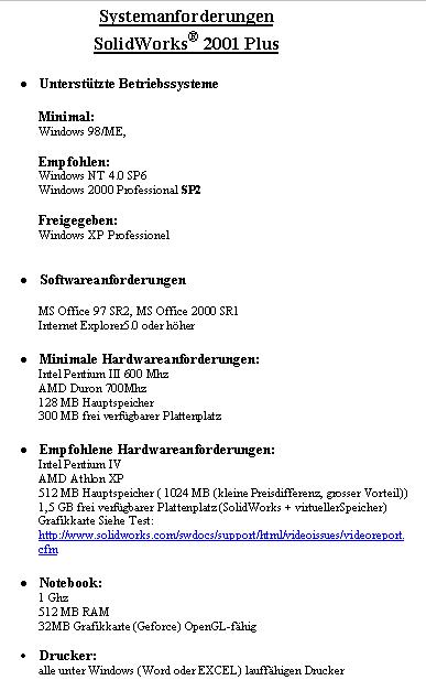 Hallo Holger, wir haben diese Frage fast täglich zu beantworten. Untenstehend findest Du die von uns im Moment empfohlene Hardware. Nur noch ein kleiner Tip, je Leistungsfähiger die Maschine sein muss um so wichtiger wird das Wort Marke. Über mögliche Probleme mit PC's Marke Eigenbau oder "Shop around the corner" könnte ich Dir ein paar Geschichten erzählen. · Intel Pentium 4 (Xeon) Prozessor, 1.5 MHz oder höher getaktet mit W2000prof Betriebssystem · Mind. 512 MB Hauptspeicher für Baugruppen bis einige 100 Einzelteile, 1 GB Hauptspeicher oder mehr bei mittleren bis grossen Baugruppen (500 - 5’000 Einzelteilen) resp. 2 GB Hauptspeicher für Baugruppen grösser 5 - 10'000 Einzelteilen · Die wichtigste Komponente der Workstation ist eine optimale Graphikkarte. Wir empfehlen z.Zt. die nVidia Quadro2 pro AGP 64 MB, die ein führendes Preis-/Leistungsverhältnis aufweist. Den aktuellsten Stand betr. Test von Graphikkarten ist bekanntlich auf der Homepage der SolidWorks Corporation unter www.solidworks.com/swdocs/support/html/videoissues/videotest.cfm nachzulesen. Gruss ------------------ Hans-Jörg Brenzikofer Support Solid Solutions AG Zürich Eine Antwort auf diesen Beitrag verfassen (mit Zitat/Zitat des Beitrags) IP |