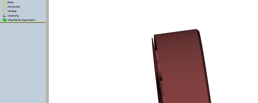 Hallo, Problem hat sich fast erledigt. Habe die Dateien in Pro/E als Stepfile gespeichert und in SW geöffnet. Der hat natürlich eine Weile dafür gebraucht. Was aber komisch war, das SW auf einem Rechner die Step Datei fehlerhaft aufgebaut hat und auf einem anderem ohne Fehler  . Natürlich habe ich die fehlerfreie Datei genommen.  Aber jetzt habe ich eins zwei Teile die hat er als Oberfläche erzeugt und sind offen (s.Bild). Wie mache ich die Teile Massiv? mfg Eine Antwort auf diesen Beitrag verfassen (mit Zitat/Zitat des Beitrags) IP |