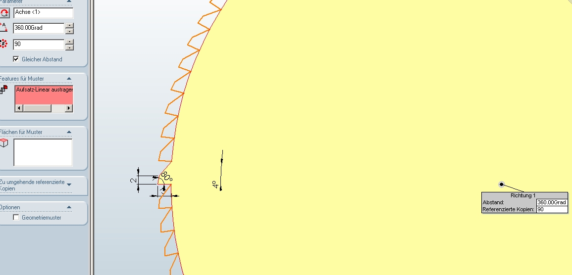Hallo, ich denke du meinst ein Kreissägeblatt. Du kannst ein Zahn zeichnen und dann über die "Kreisförmige-Reige" im gleichen Abstand kopieren (d.h. du gibst díe Anzahl der Zähne an) und achte darauf, dass in dem Feld "Gleich" ein Häckchen ist. Ich hoffe, dass das die Lösung war adam